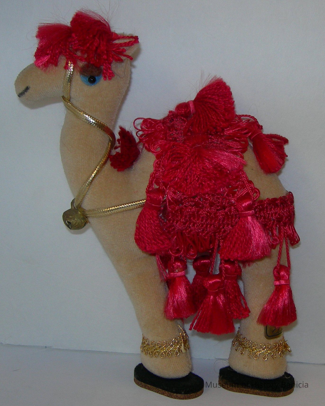 Stuffed standing camel made of tan cloth. Its harness with bell is made of gold cording and the ankle wraps are gold trim. The saddle, blanket and topknot are red edging with tassels. The eyes are felt with black beads in the center. It has felt topped thin cork "shoes". A label is on the back leg: "Custom designed by Elizabeth".Collection