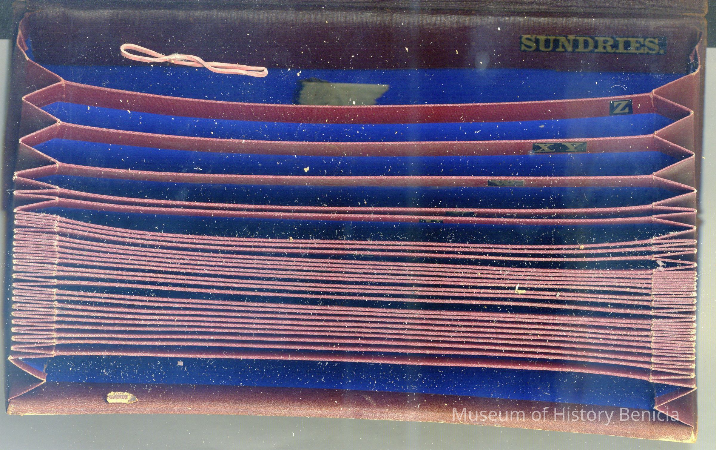 This is an accordian file holder for papers. It is made of leather and has spaces inside which are alphabetized. It was owned by Joe Guibbini of Benicia. The papers inside when donated were mainly about his U.S. patents.Collection