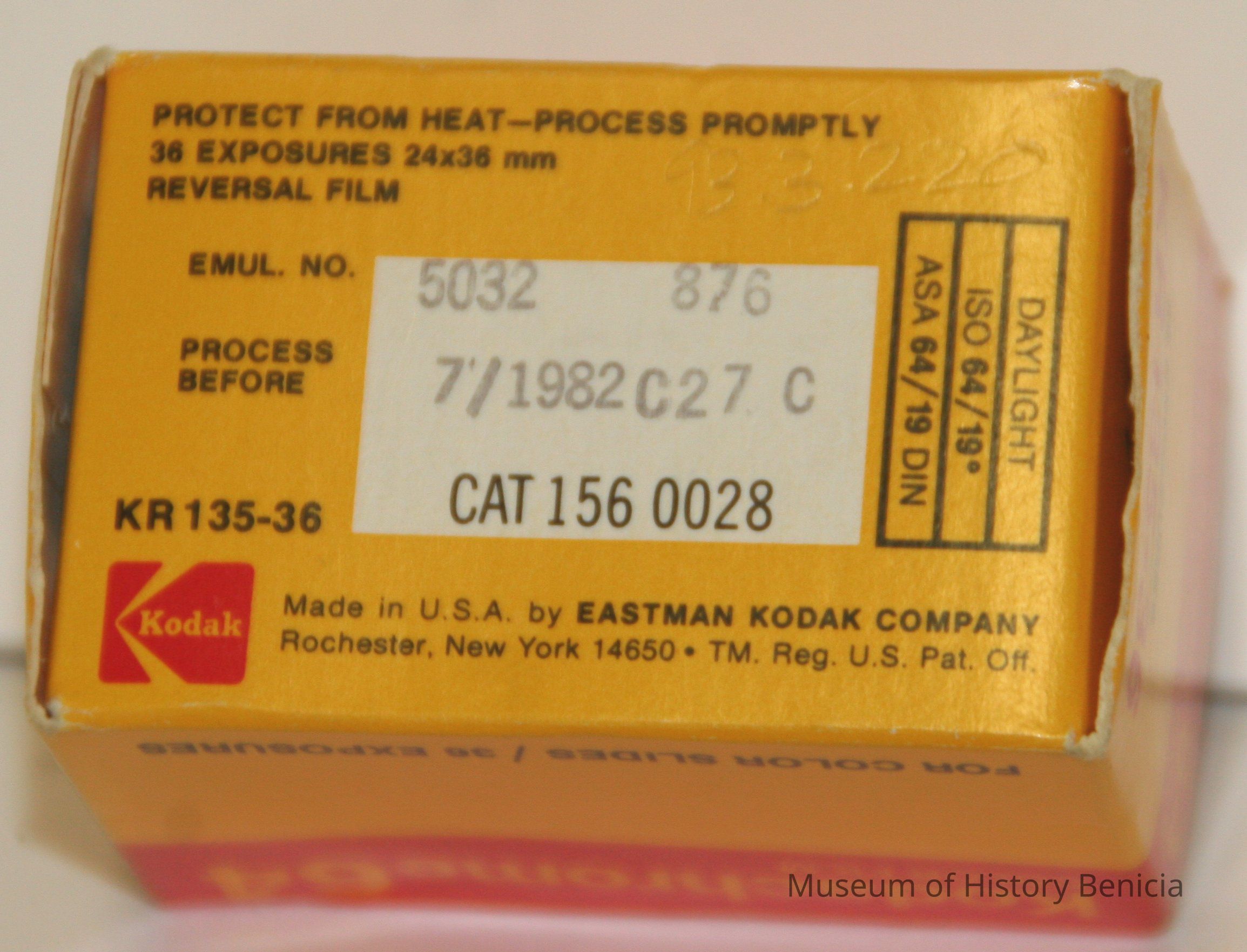 Kodachrome 64 color film for color slides. 36 exposures, KR 135-36, stamped on side: "Emul. no 5032 876 Process before 7/1982 C27C