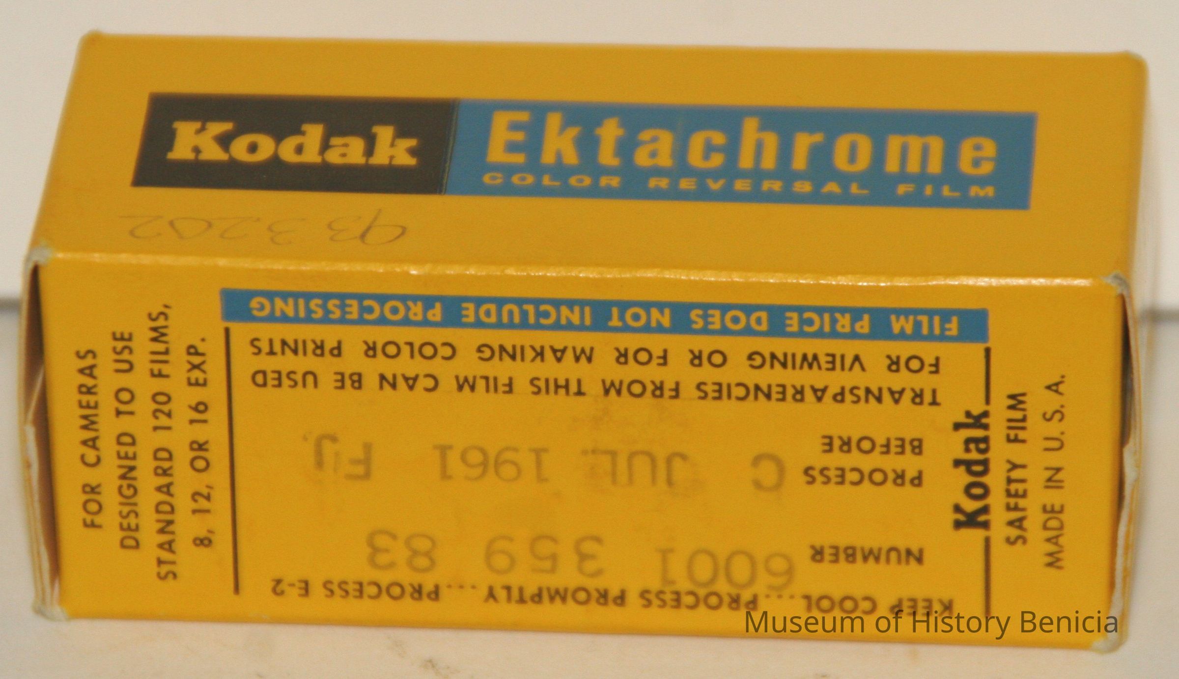 Yellow, black, and blue box "Kodak Ektavchrome color reversal film for daylight E120" Box has not been opened yet. Expiration 07/1961