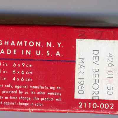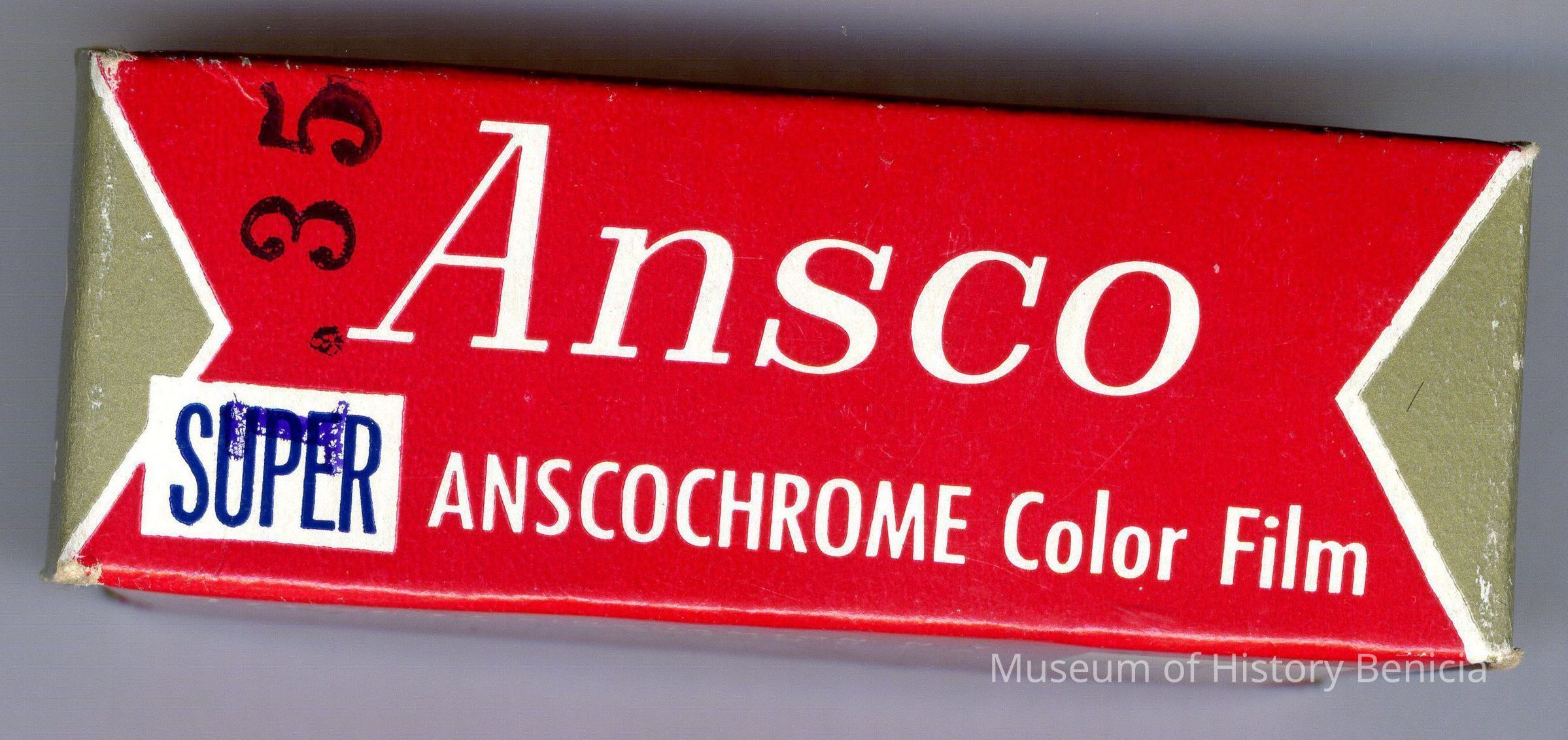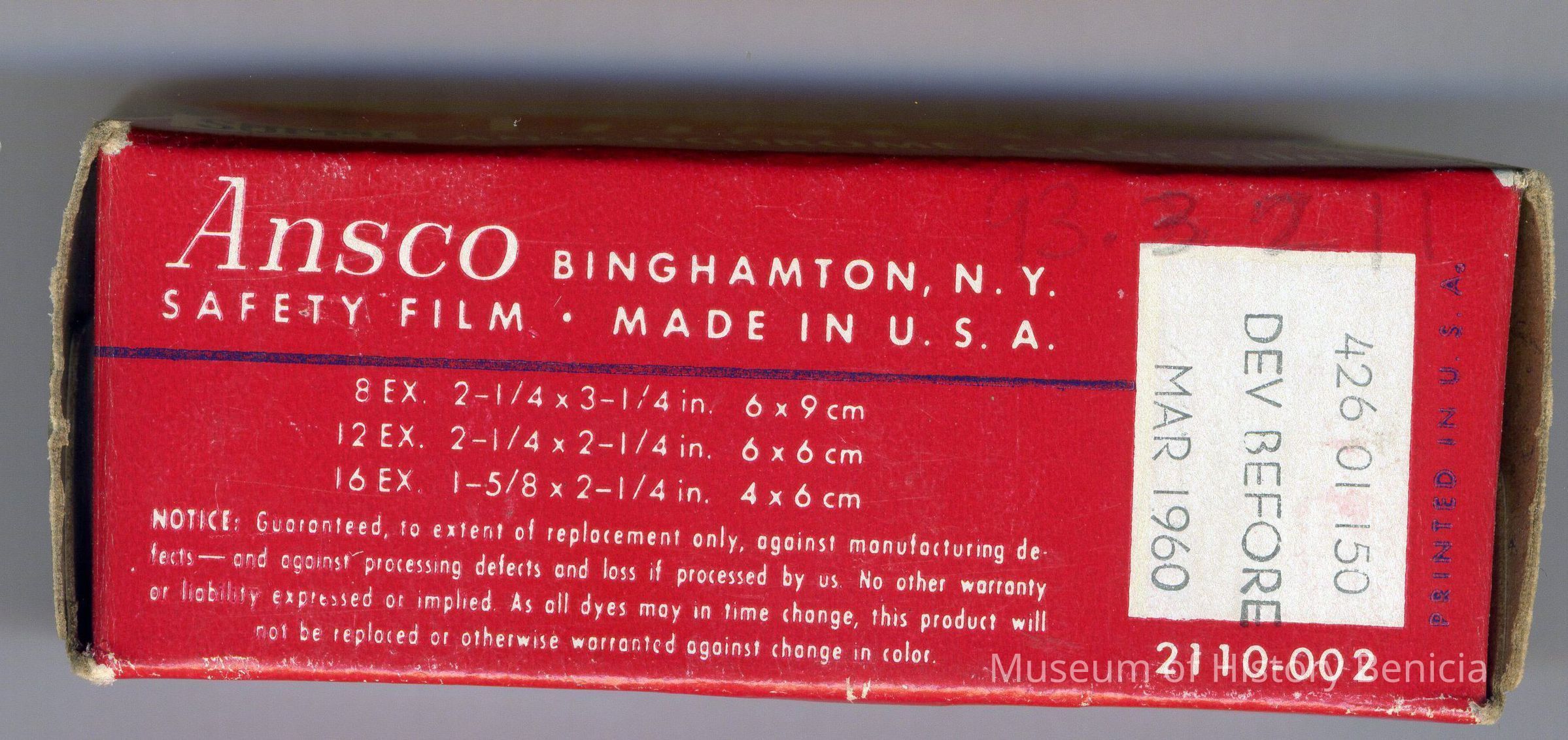 "Ansco super-speed color film" in a red and gold box with "135" stamped on it. Also stamped on box: "426 01 150 Dev before March 1960" Box is unopened.