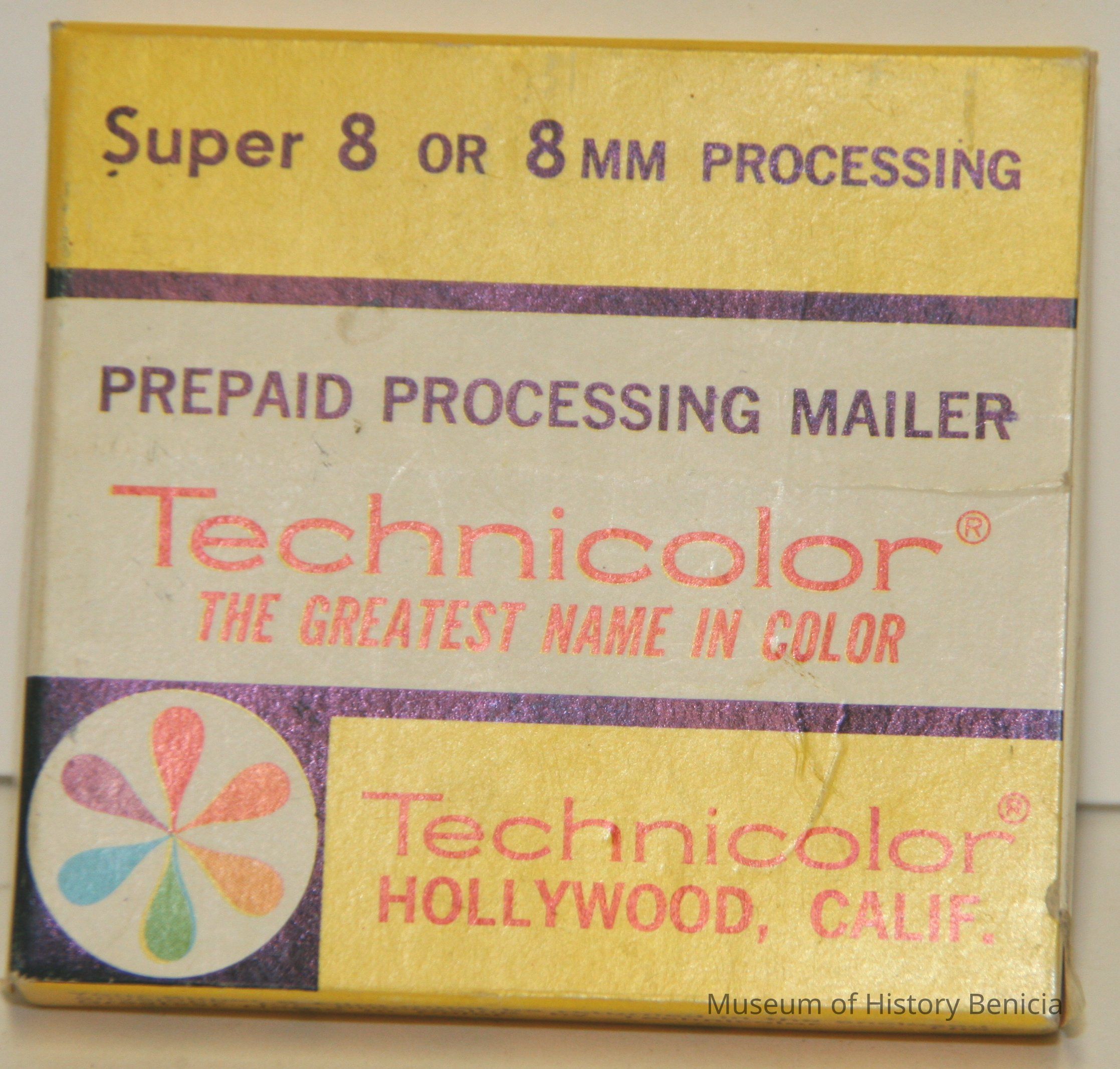 Super 8 or 8mm processing mailer Technicolor (R), Technicolor Hollywood, Calif. Box is multi-colored.