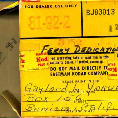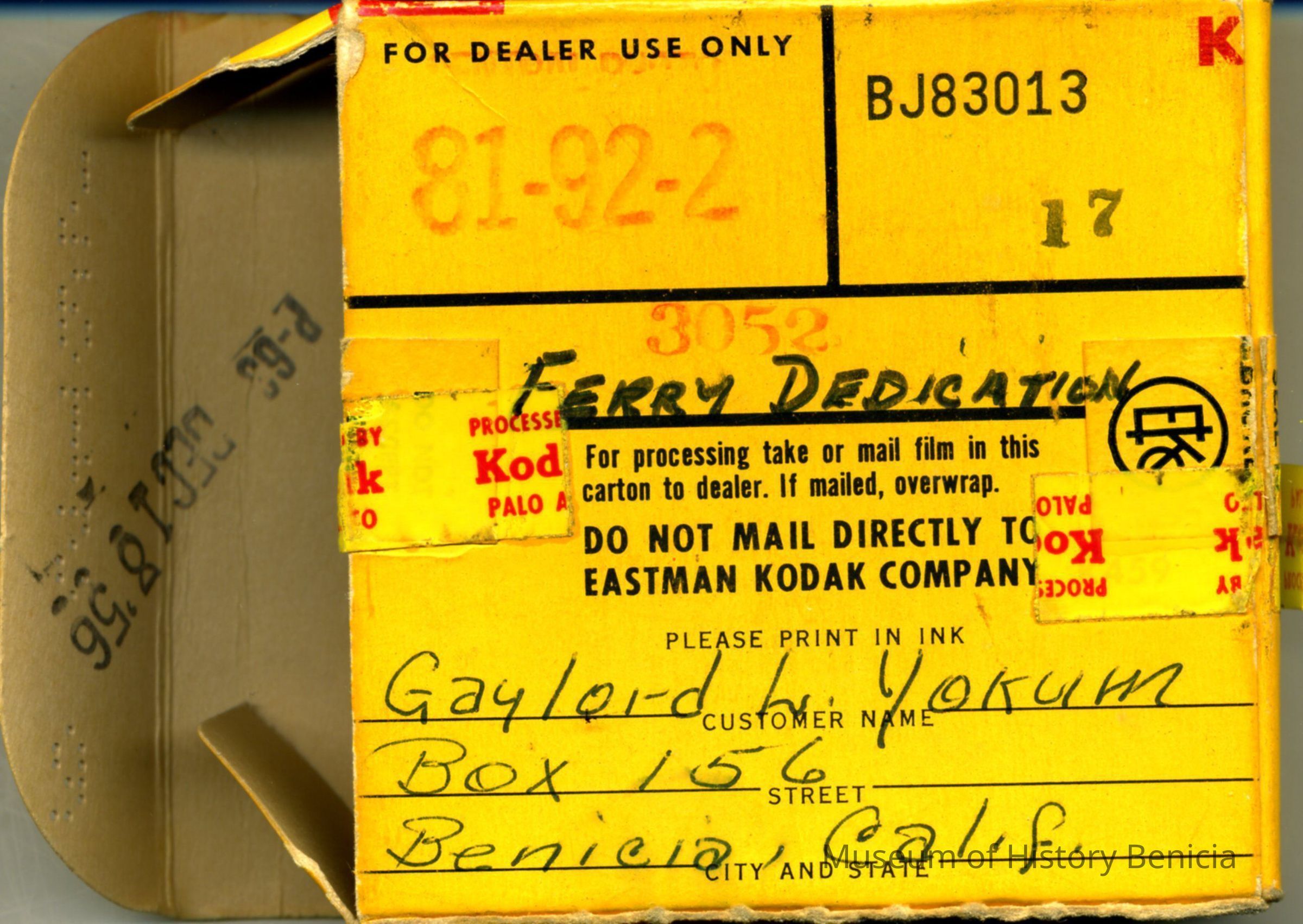 8mm motion picture film - one 25" reel in box: Dedication of Benicia Martinez Ferry "Carquinez" which replaced the "Charles Van Damme (side wheel) in 1957