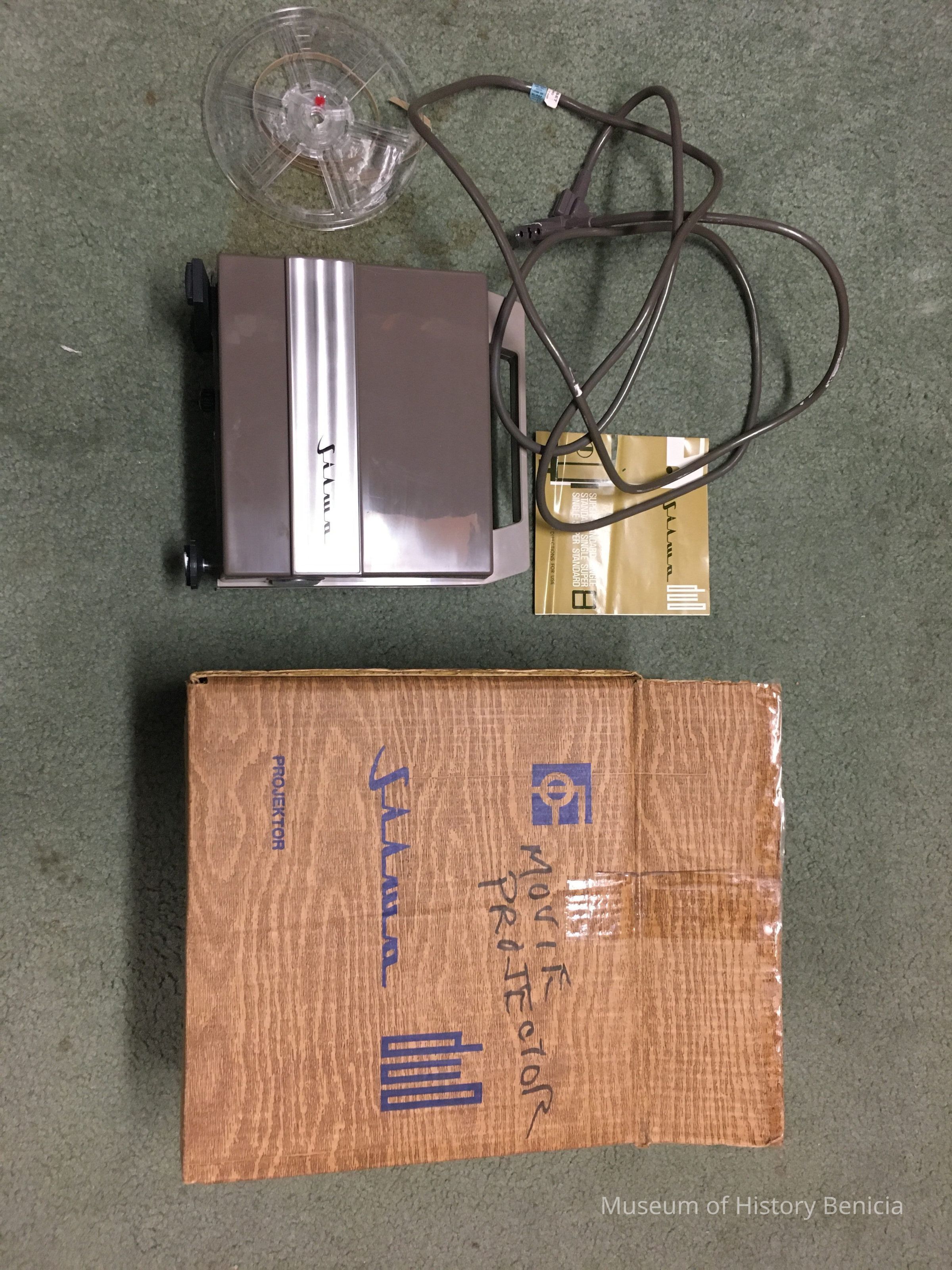 Silma projector for Super 8 mm film. Complete with reel. instructions, cord and original box. Made in Italy circa 1960.