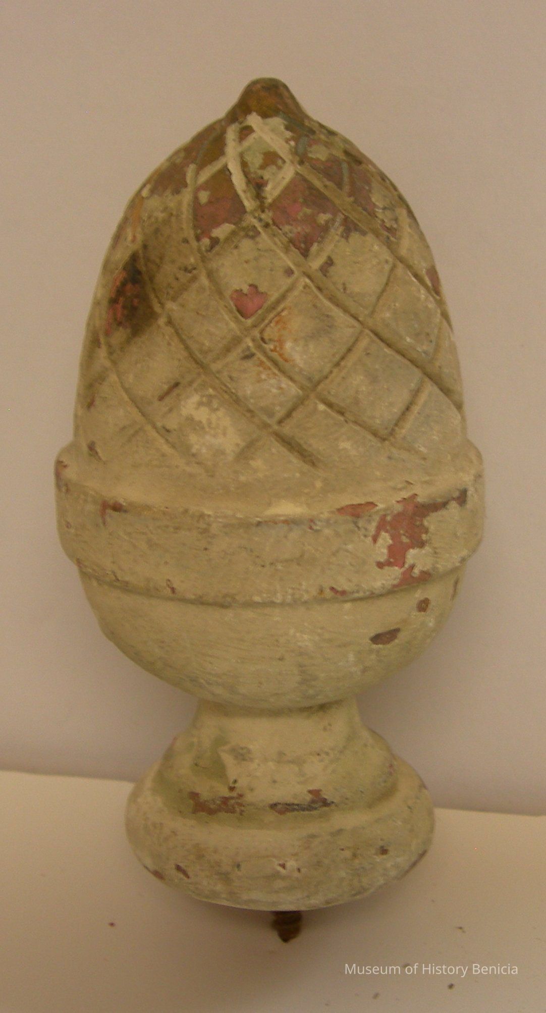 Finial - painted wood; "pineapple" design; 1/2" threaded screw in bottom; 4-1/4" tall x 2-1/4" wide; 1-3/4" bottom diameter.