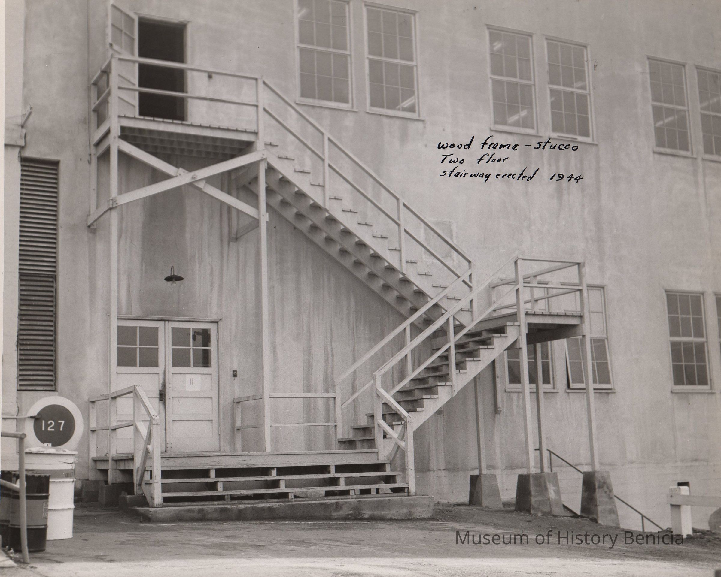 B/W Photograph: building 56 wood frame, stucco, two floors, stairwell (fire escape) erected 1944Collection