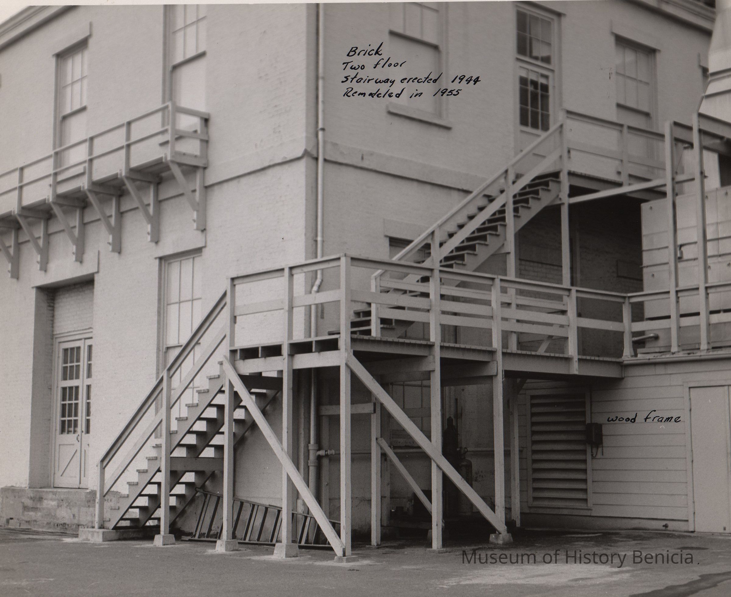 B/W Photograph: Building 49 - brick, two floor, stairway (fire escape) erected in 1944; a section of the building is wood frame