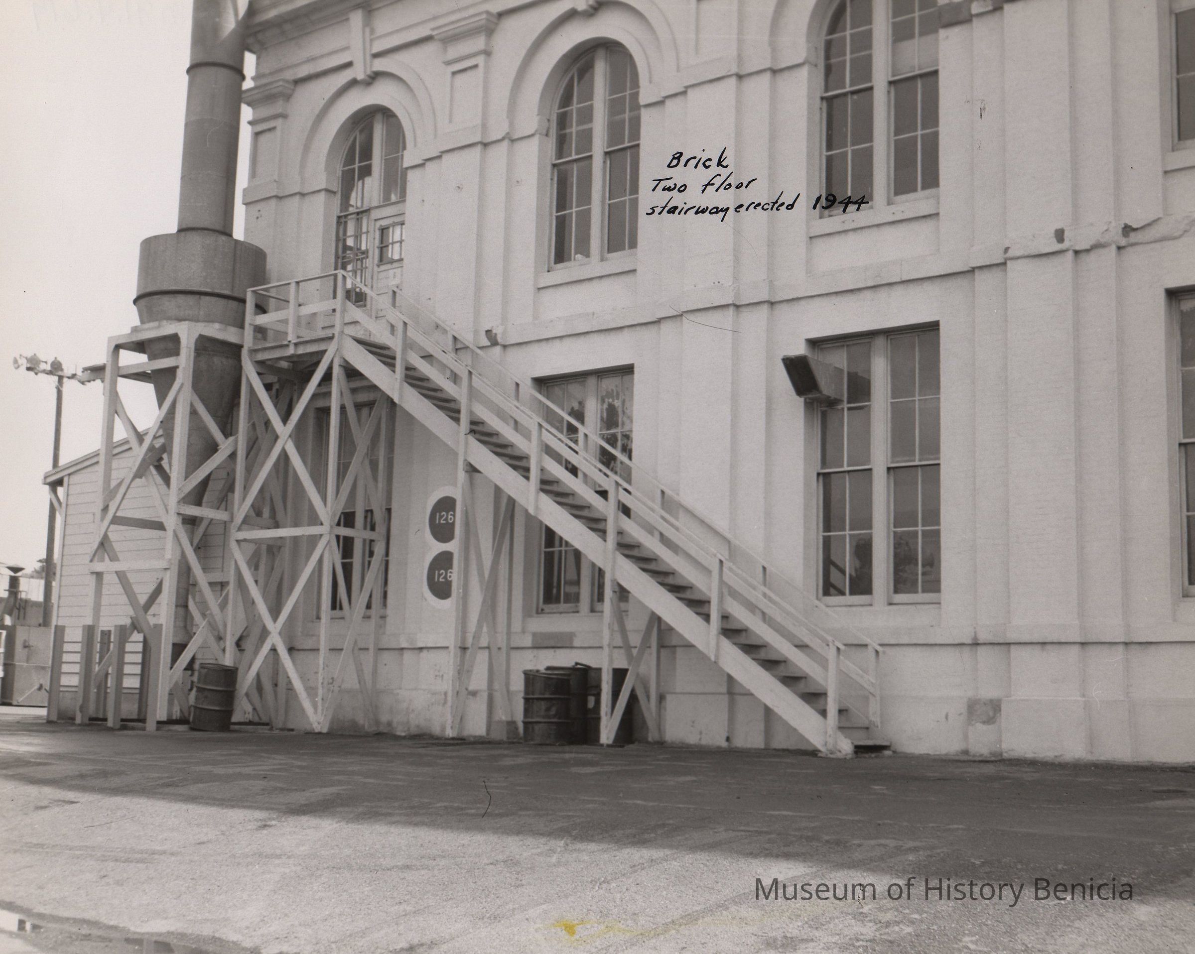 B/W Photograph: building 57 brick, two floors, stairwell (fire escape) erected 1944Collection