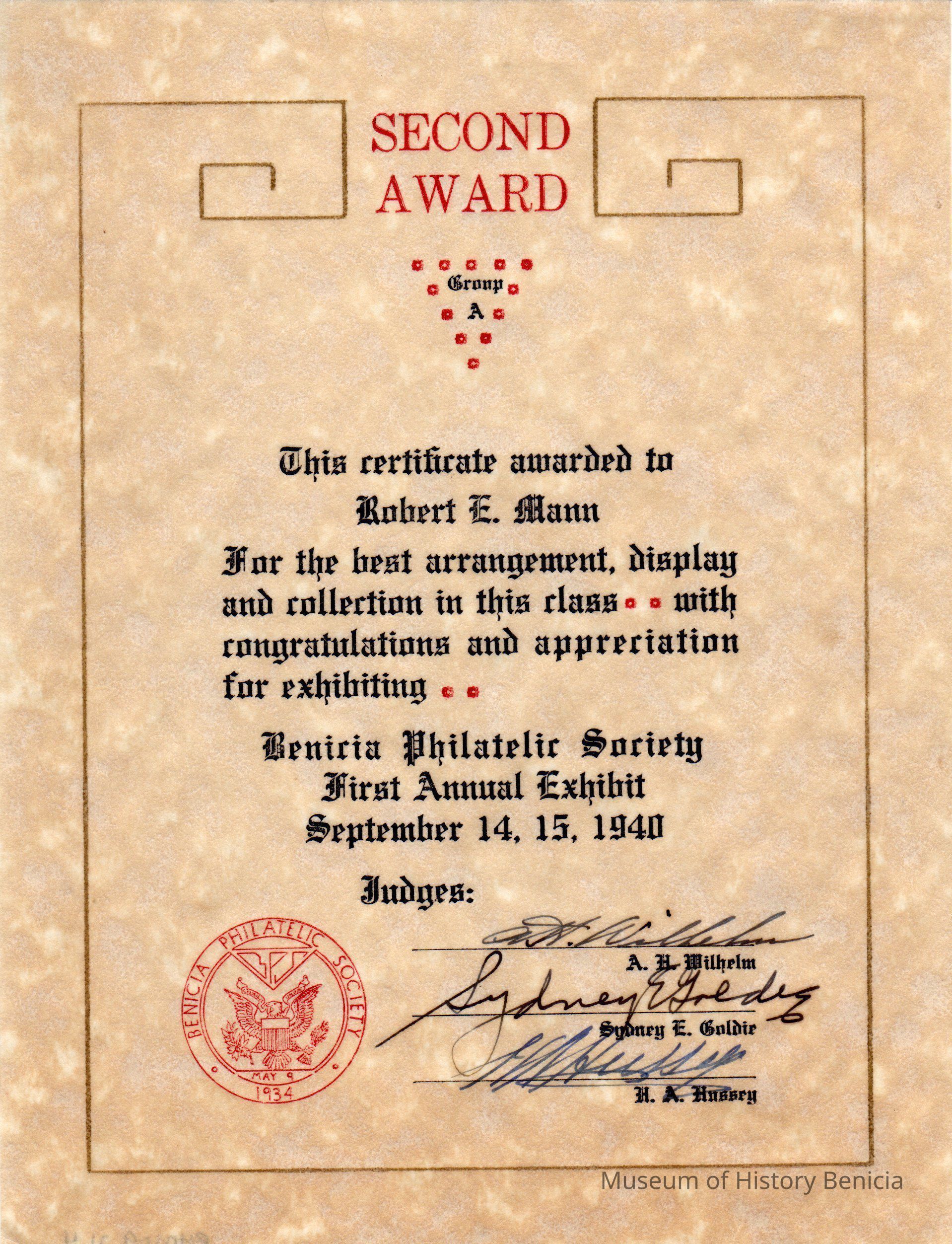 Certificate awarded to Robert Mann for the best arrangement display and collection in this class awarded on September 14-15, 1940. Includes Judges signaturesCollection