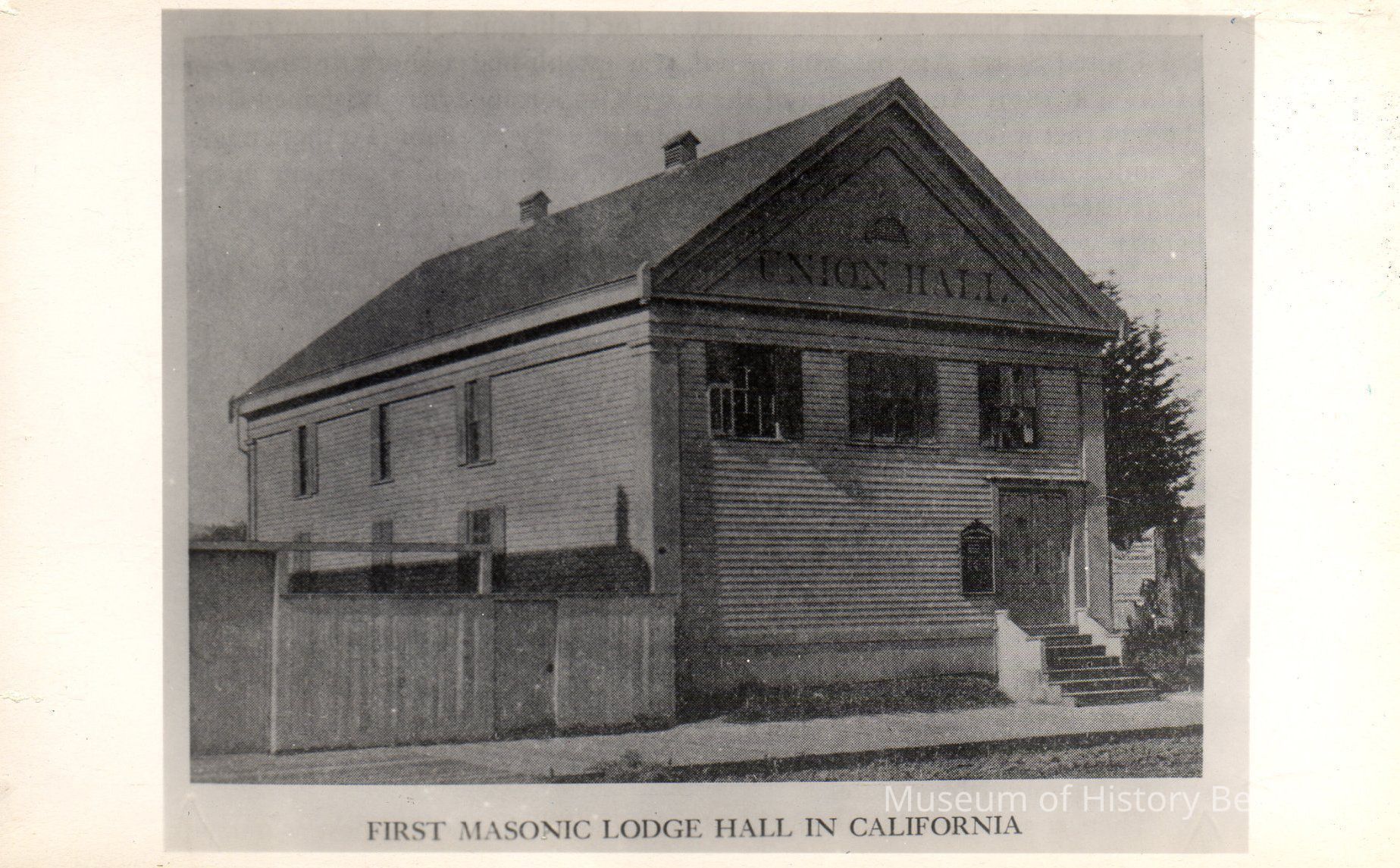 B/W photograph on a postcard: The First Masonic Lodge Hall in California, located on West J Street. On the back of the card written in blue ink: "Picture used through the courtesy of Leon Whitsell".Collection