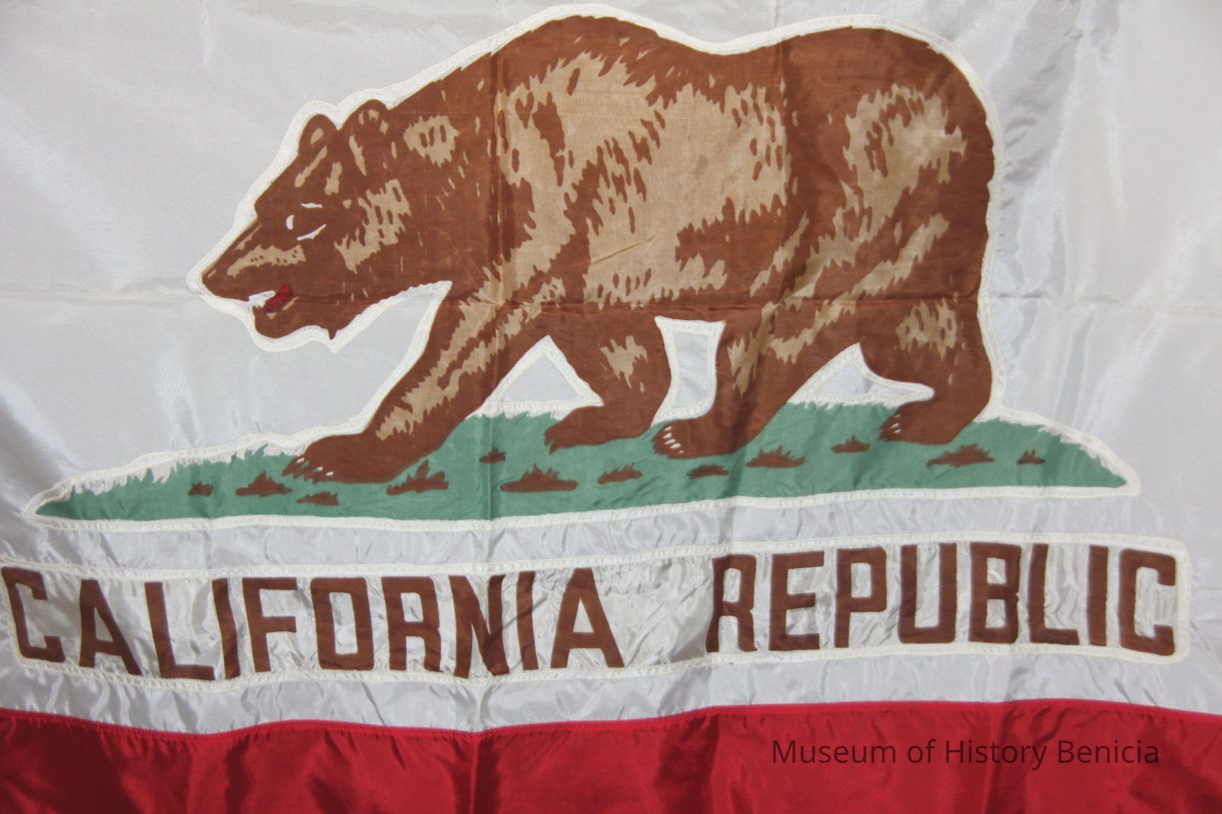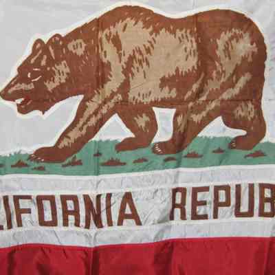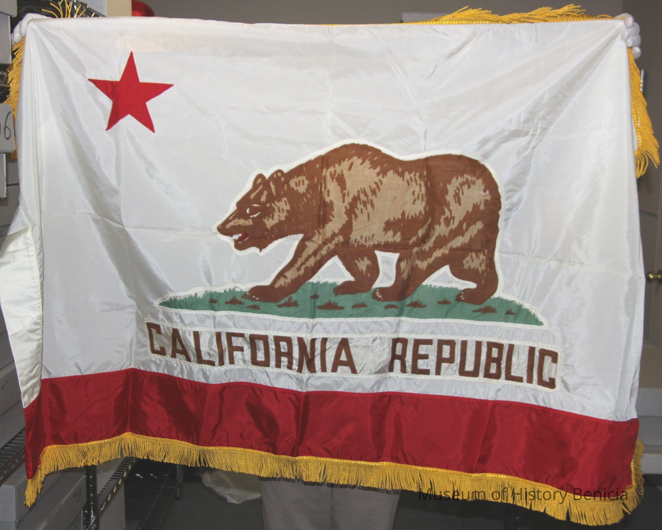 California Flag - has a tag on it showing the number "1". Synthetic material with gold fringe.