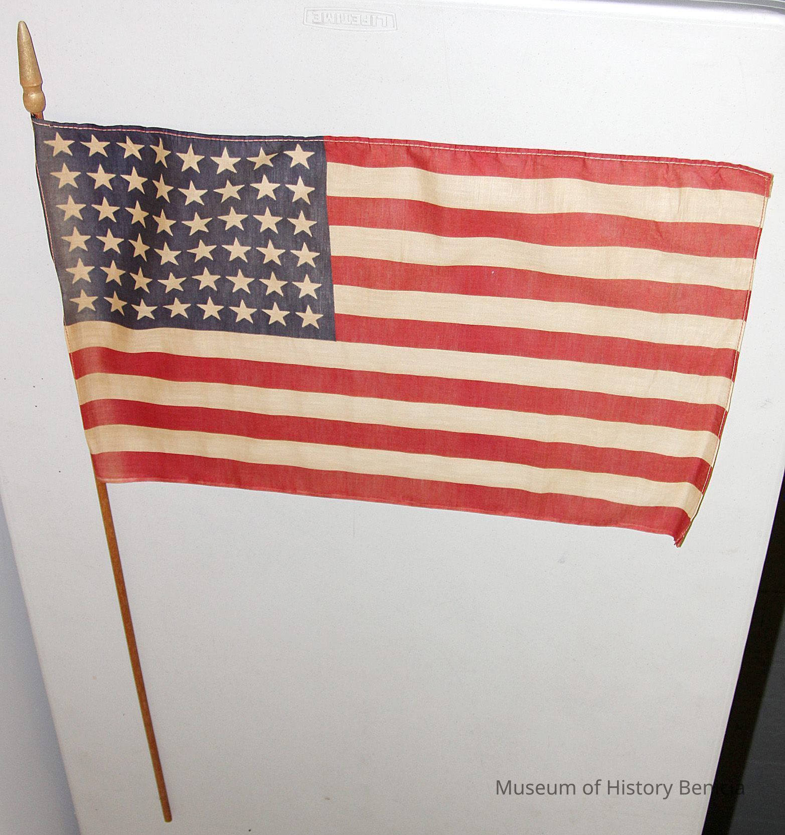 48 star American Flag with brown stick attached.