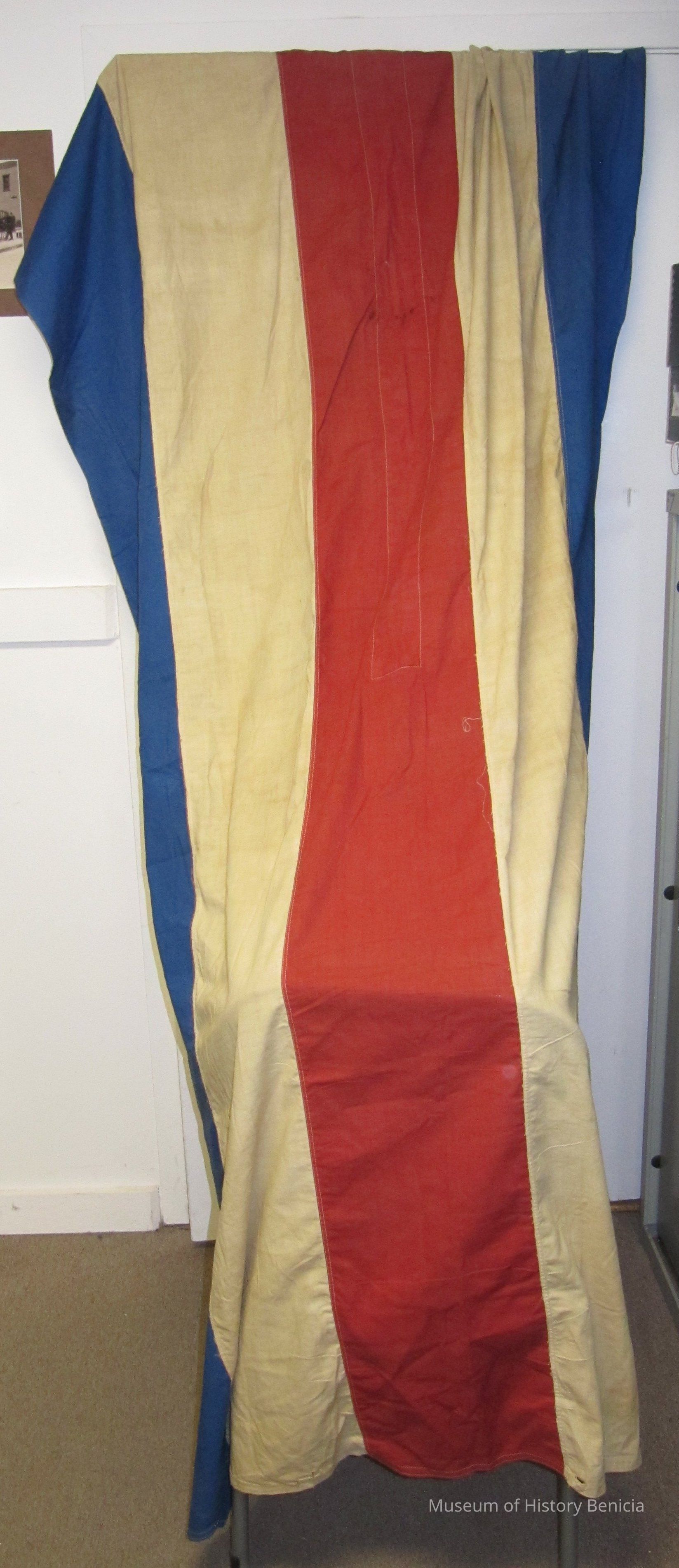 In 2005 the Benicia Historical Museum was made aware of it's existence and history. This "flag" has stripes of blue, white, red, white, blue. It may have been used as bunting not an ensign. It has considerable signs of wear. It is 56" x 89".Collection