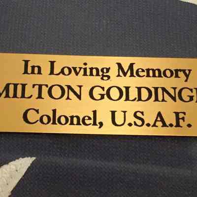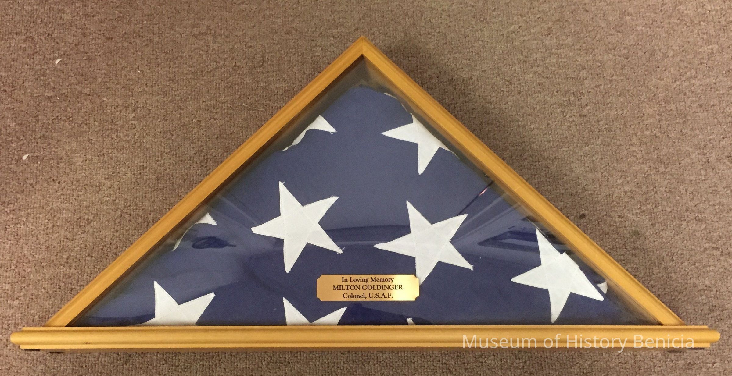 An American Flag folded and presented, usually to the wife, at the end of a military funeral service. This flag is encased in a wooden triangle box with a glass viewing top. An inscribed metal plaque reads 'In Living Memory MILTON GOLDINGER Colonel, U.S.A.F.' Colonel Goldinger was born on July 14, 1909 and passed on September 20, 1986. From September 2, 1927 until his retirement on September 12, 1962 he had a distinguished military career serving as an attorney and counselor in the General Military Courts. In 1962 while stationed at Travis Air Force Base he was appointed to the Ninth Circuit of the United States Court of Appeals as an Attorney and Counselor. During this time Colonel Goldinger was in a private law practice for nine years in New Jersey.Collection