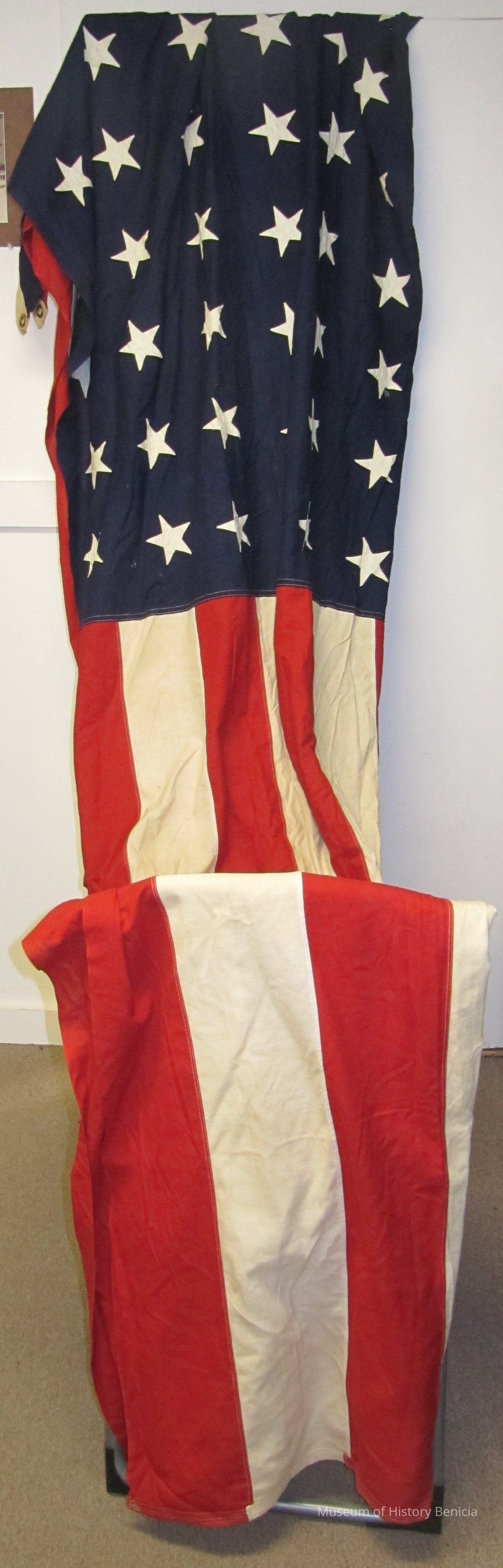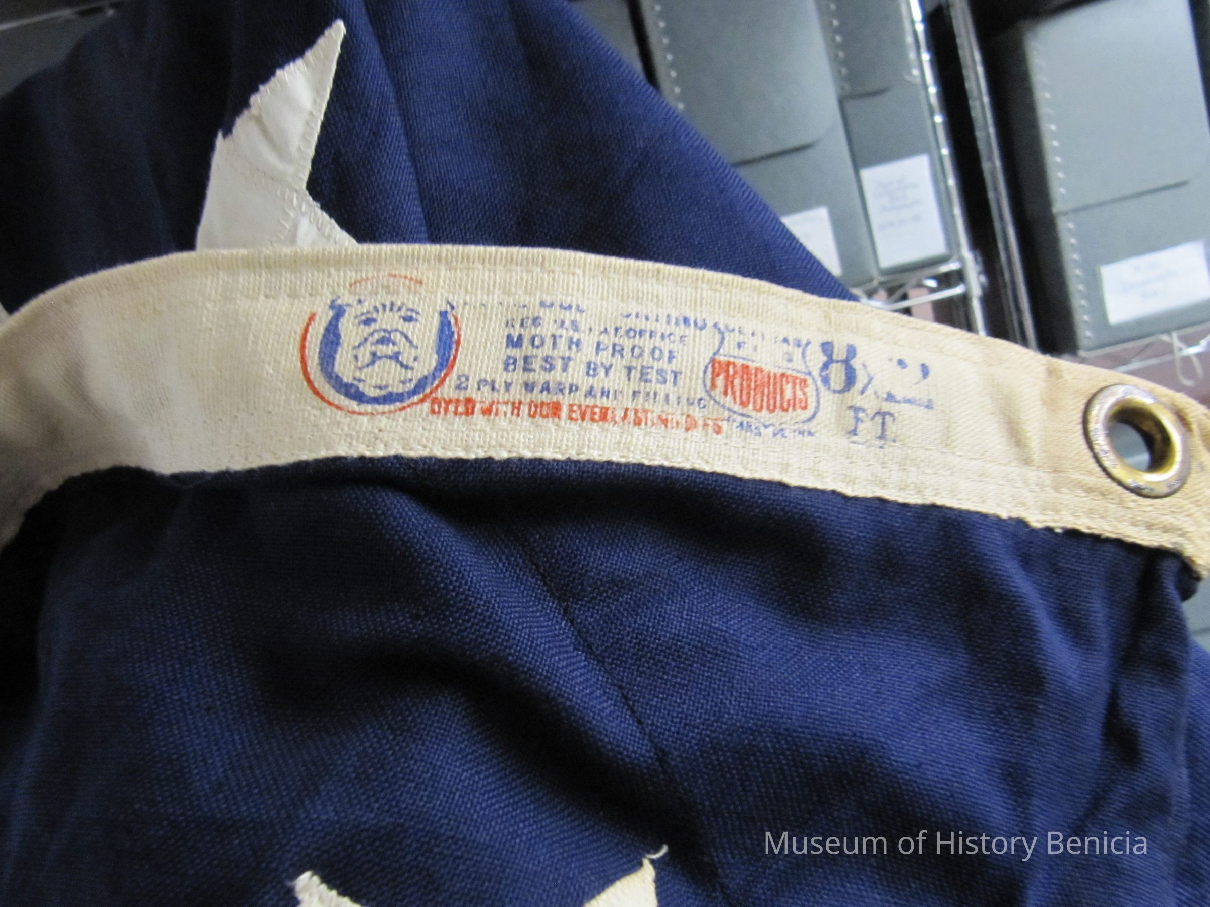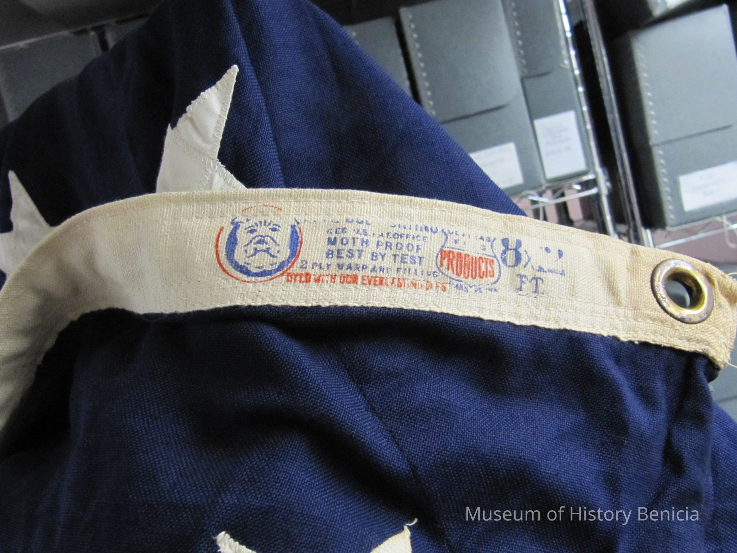 This flag was stored in a wooden box in the attic of the Benicia City Council for many years. The box was inscribed: