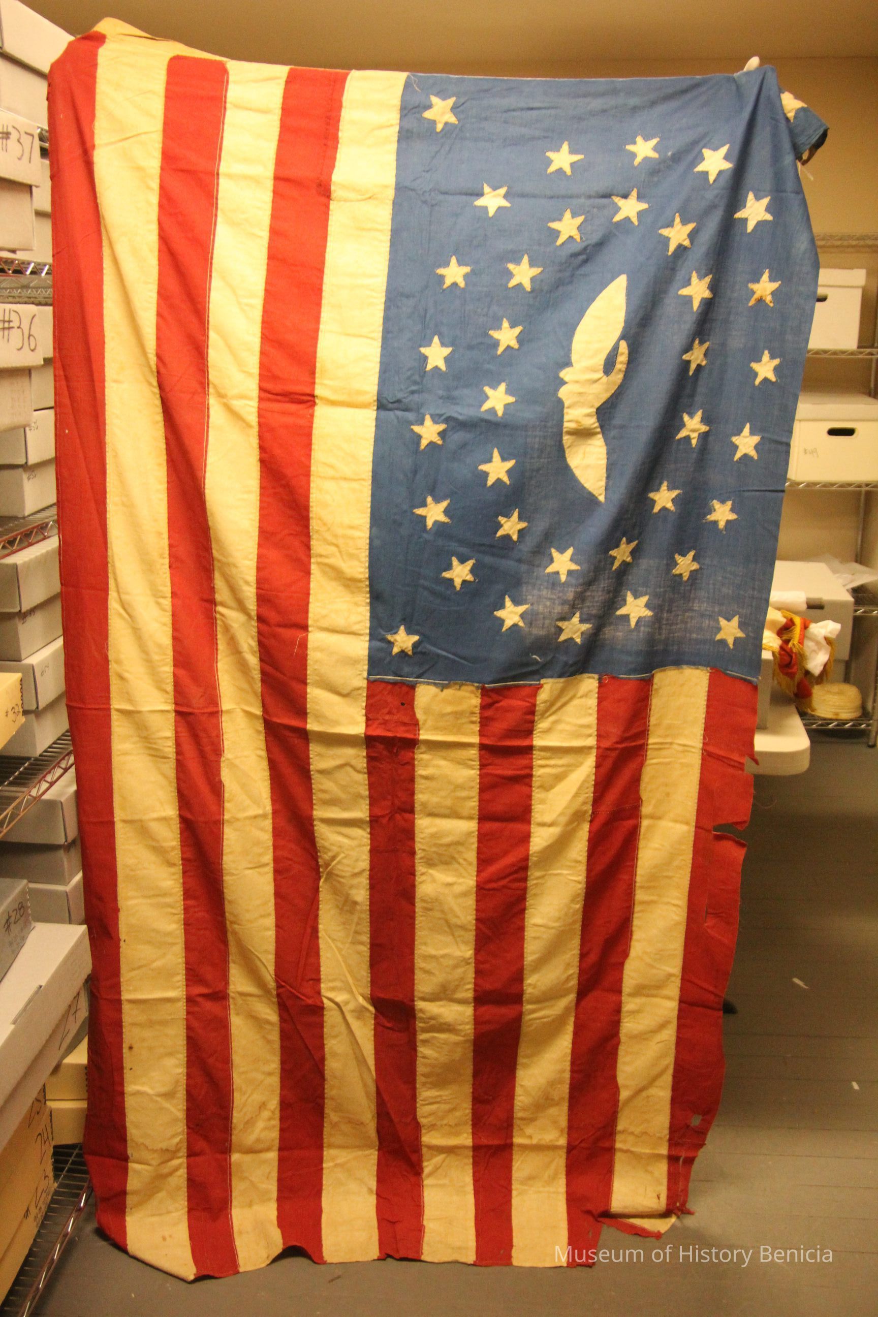 Red, white Blue. 13 red and white stripped blue field with white bird surrounded by 13 white stars and a circle of 18 stars. Blue field has a star in each corner hand made. Flag wrapped in white cotton cloth with 3 strings wrapped around wood piece.Collection