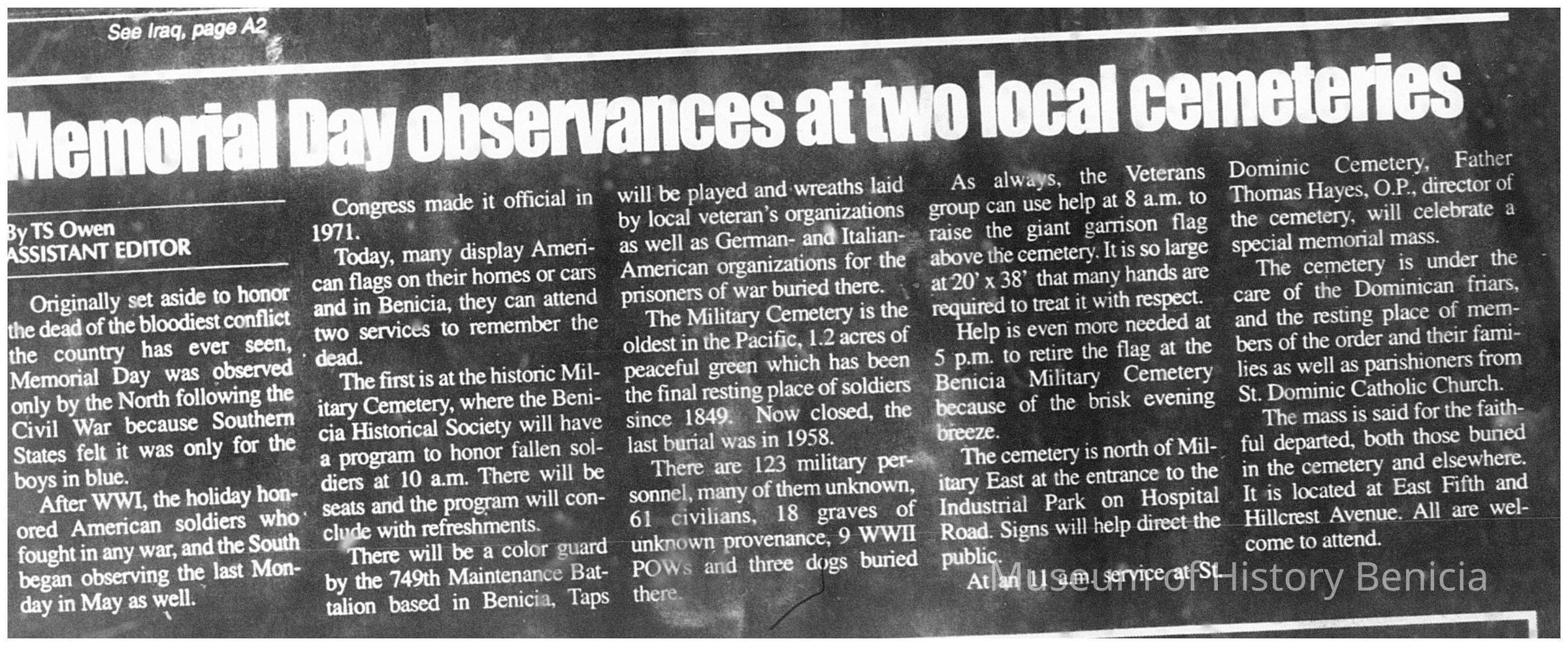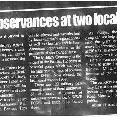 This is a 2005 U.S. flag. It was used by the Benicia Veterans and flown at the Benicia Military Cemetery on Memorial Day (see attached article). It is 20 feet x 38 feet. This is an example of a Garrison flag. A garrison flag is a U.S. Army term for an extra-large national flag that is flown on Sundays, holidays, and special occasions.Collection