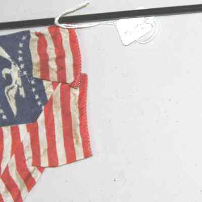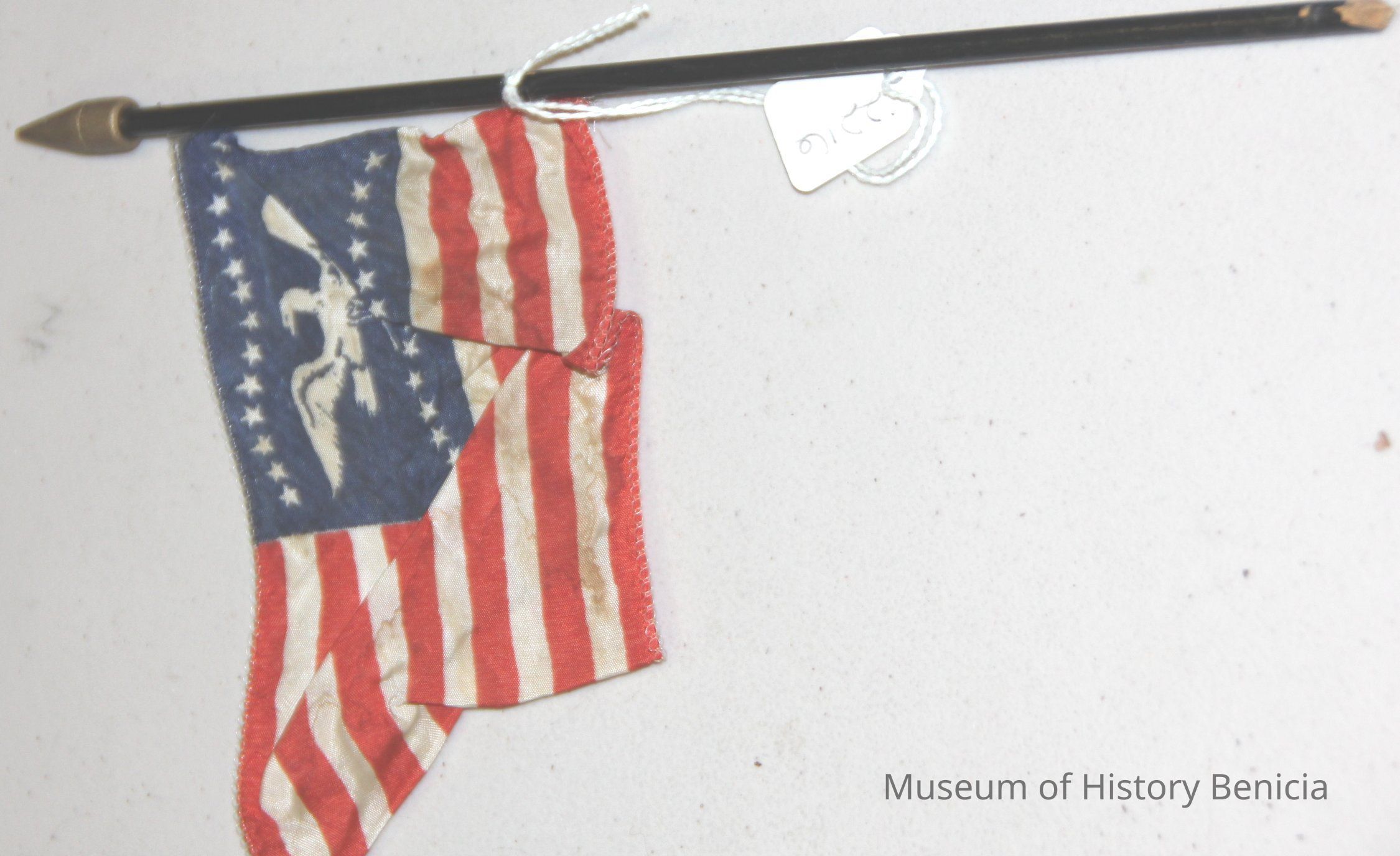 American flag 26 stars, black dowel handle with gold spear point tip. American eagle motif on star field. This is a Fremont Flag.
