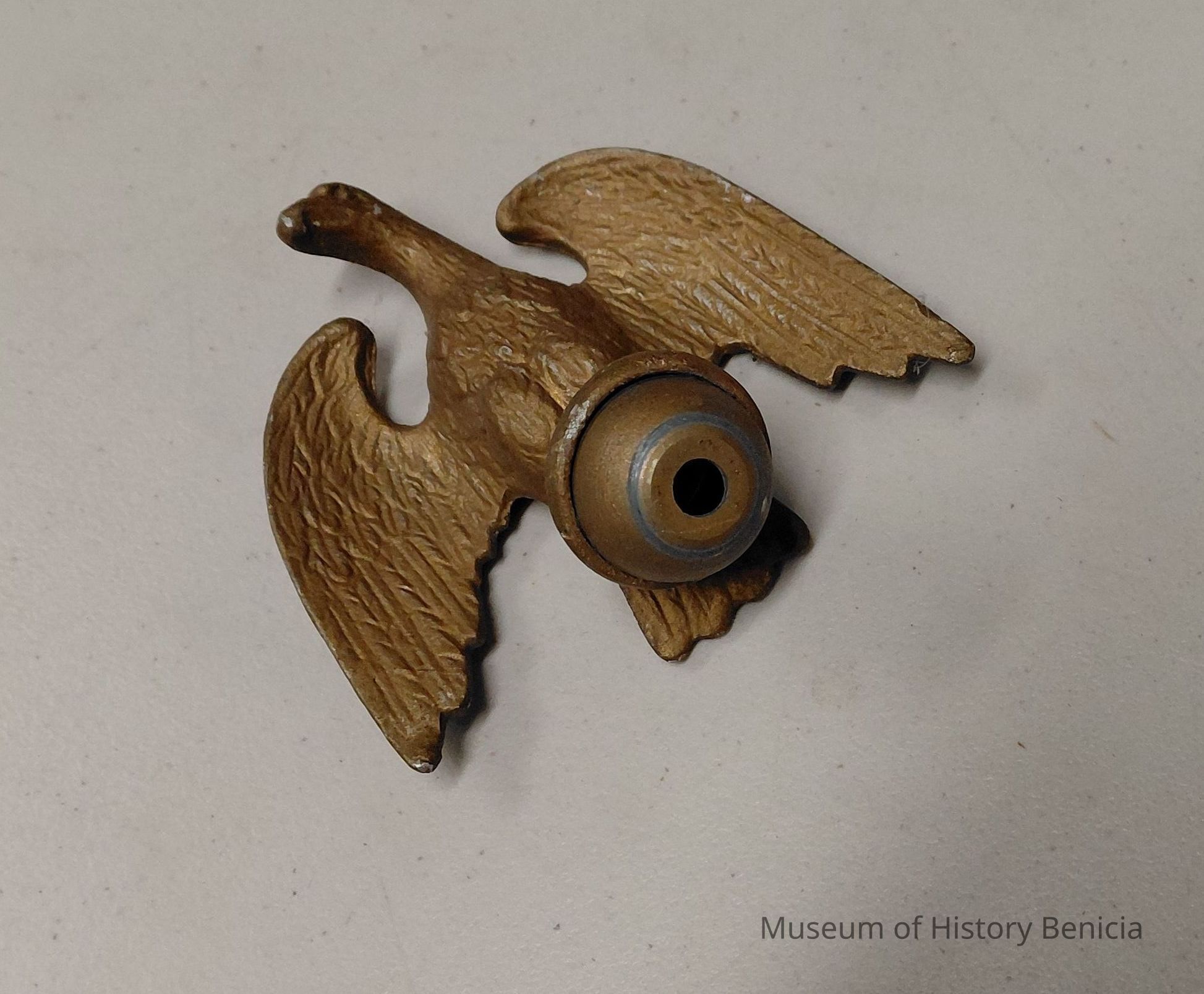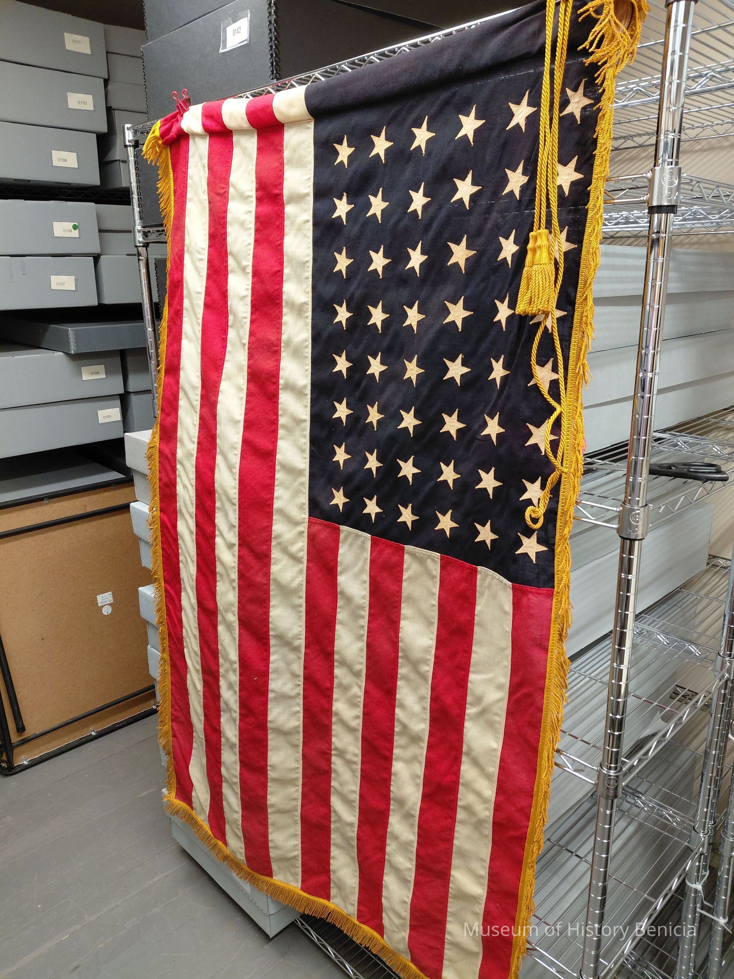 A large, woven linen-type flag from the Congregational Church in Benicia. This is a 48 star American flag. There is gold fringe around the perimeter of the flag. The flag is mounted on a 6 ft. wooden pole. There is a decorative eagle as the pole finial and two gold cords/tassels. The flag measures approximately 3 feet by 5 feet.