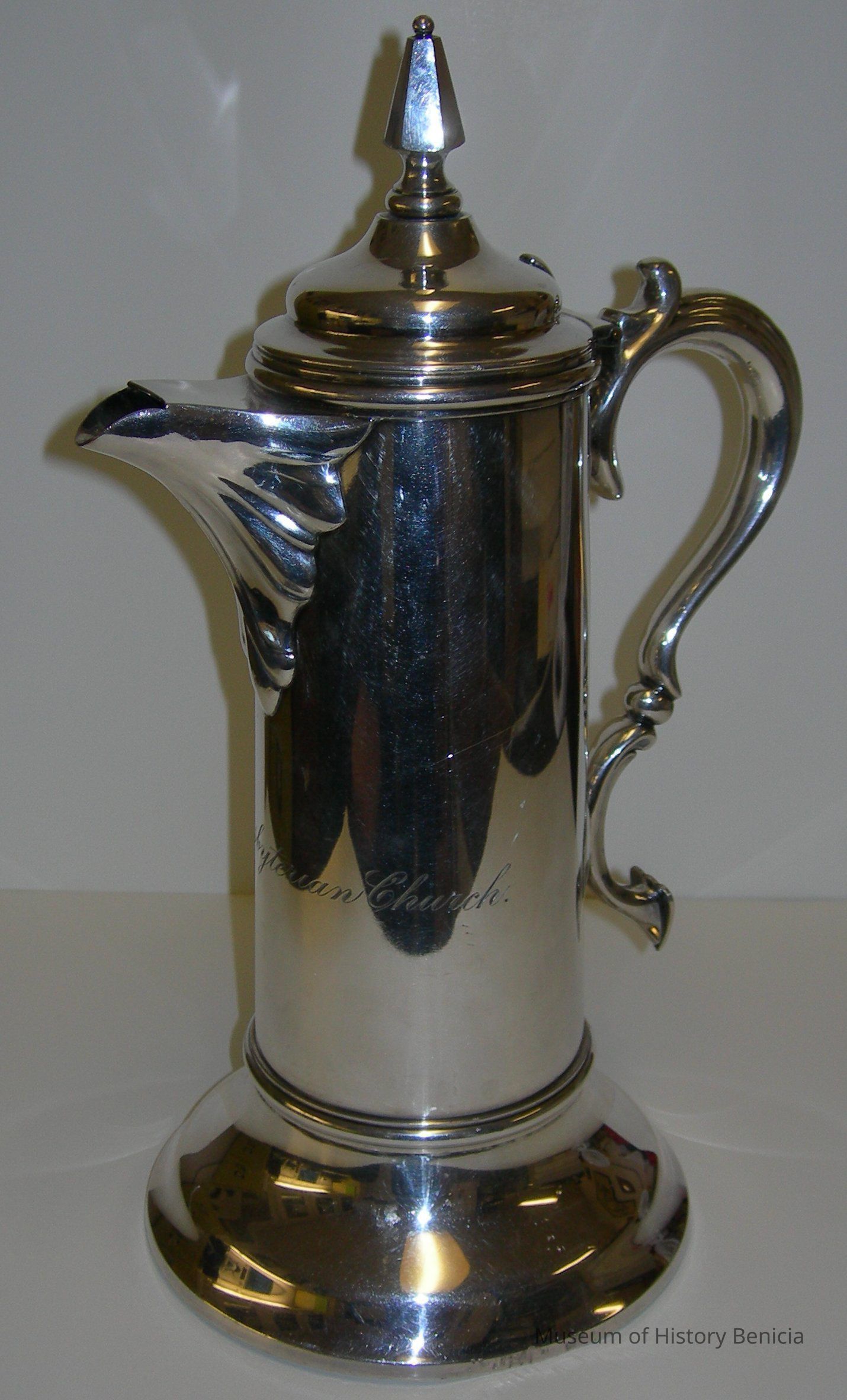 Silver communion pitcher "flagon". Etched on pitcher is "Valona Presbyterion Church"