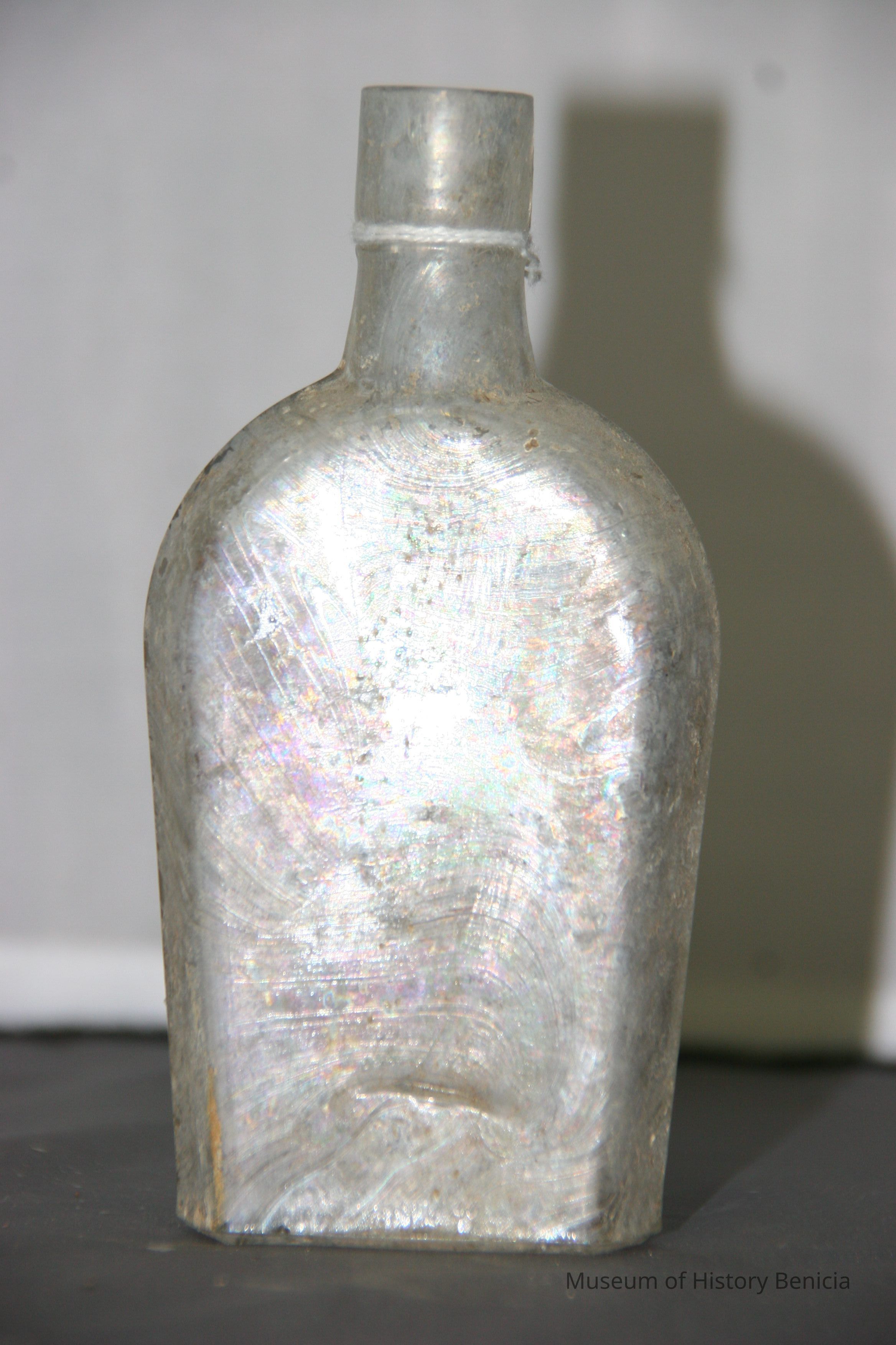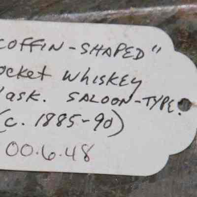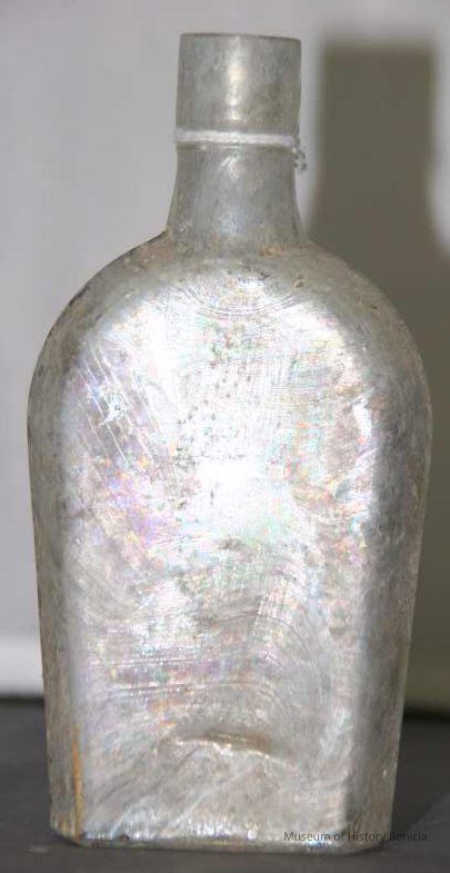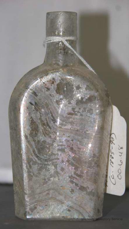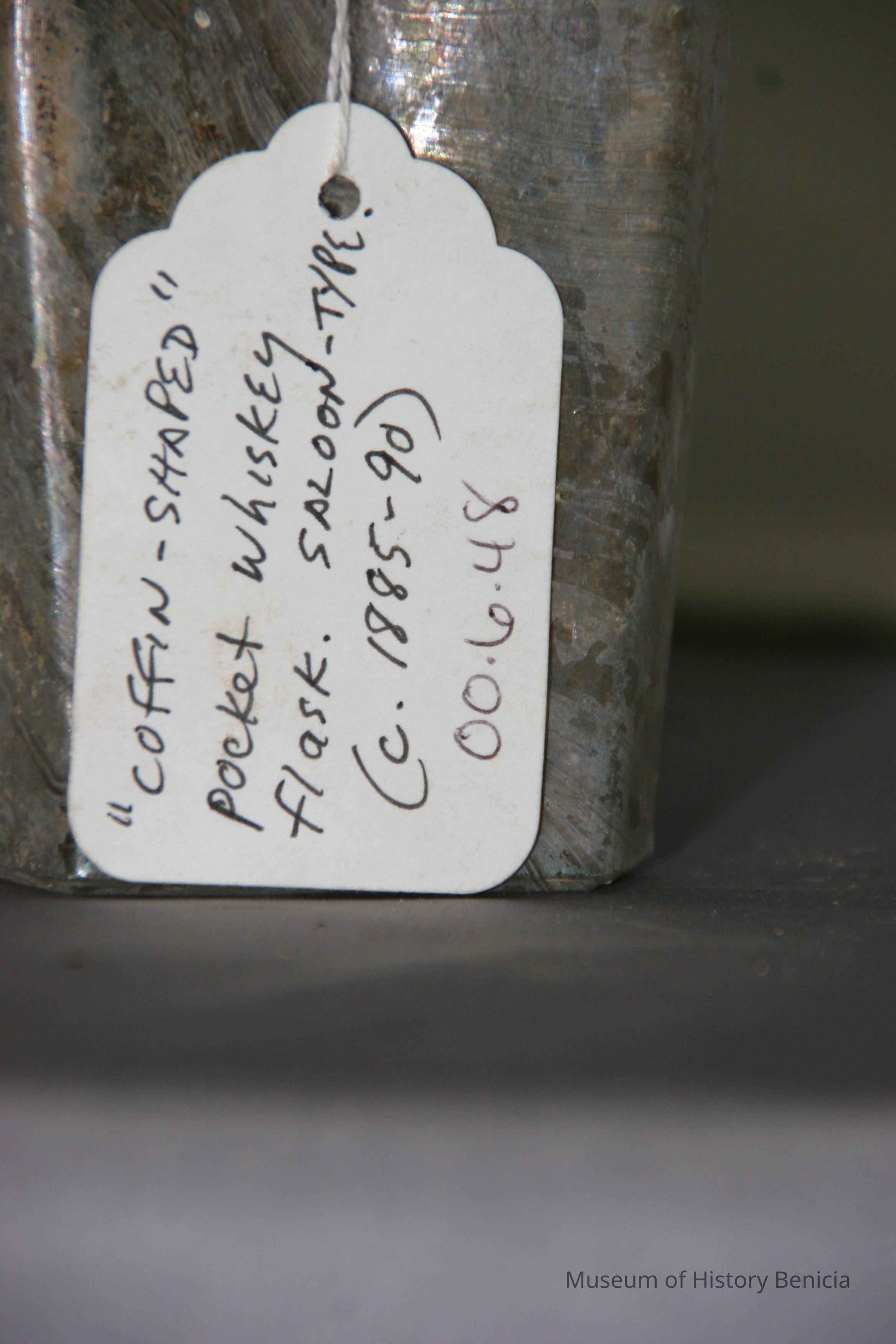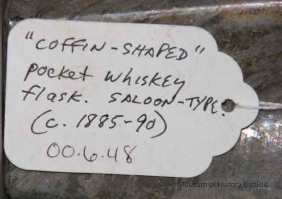 "Coffin-shaped" pocket whiskey flask found at Benicia Barracks site; found near current site of the National Guard Armory on Hillcrest Avenue in Benicia.