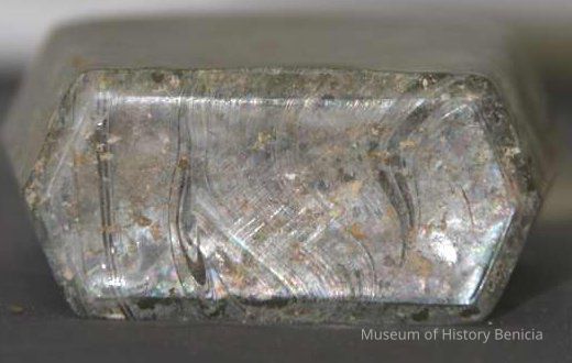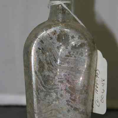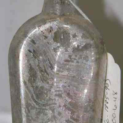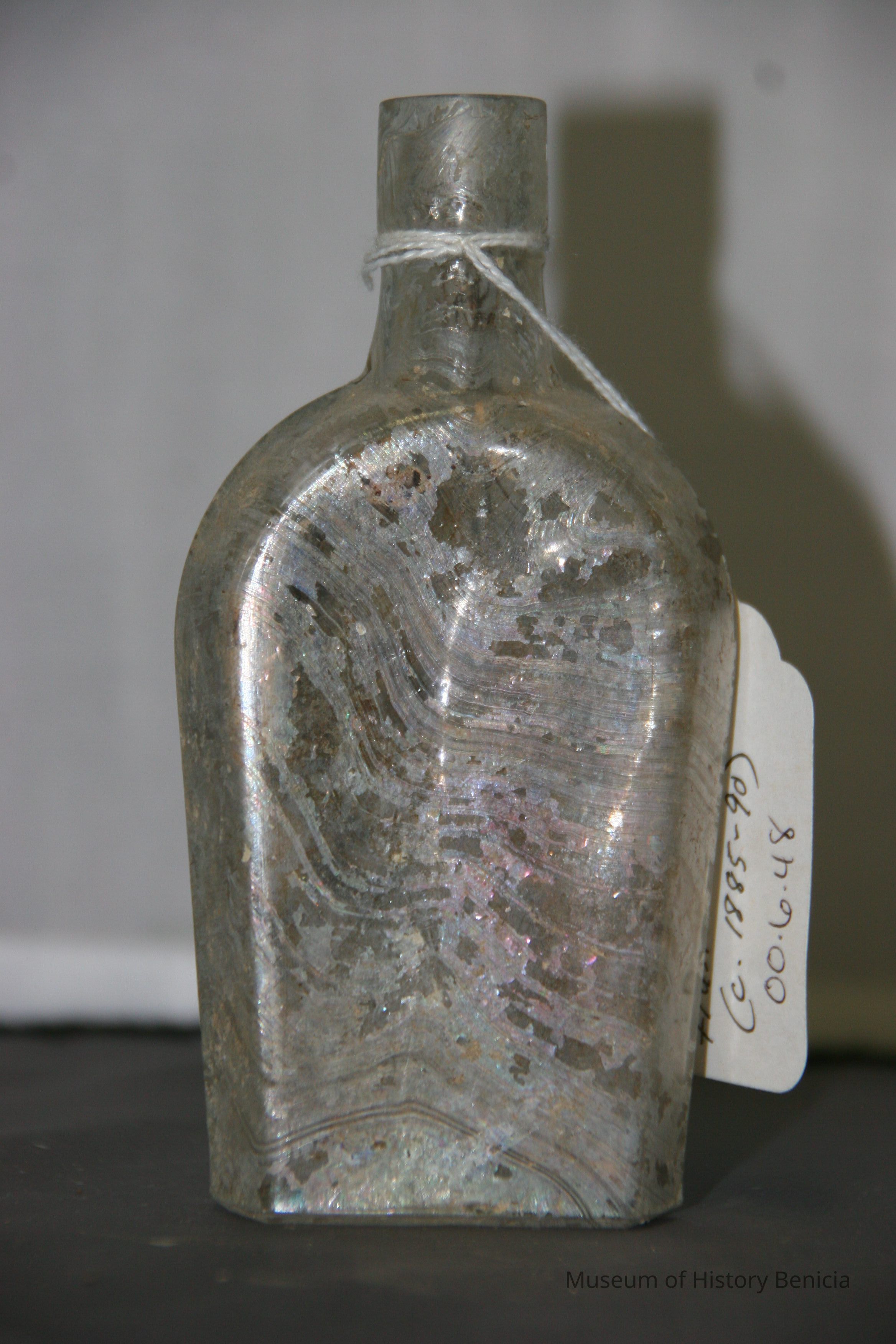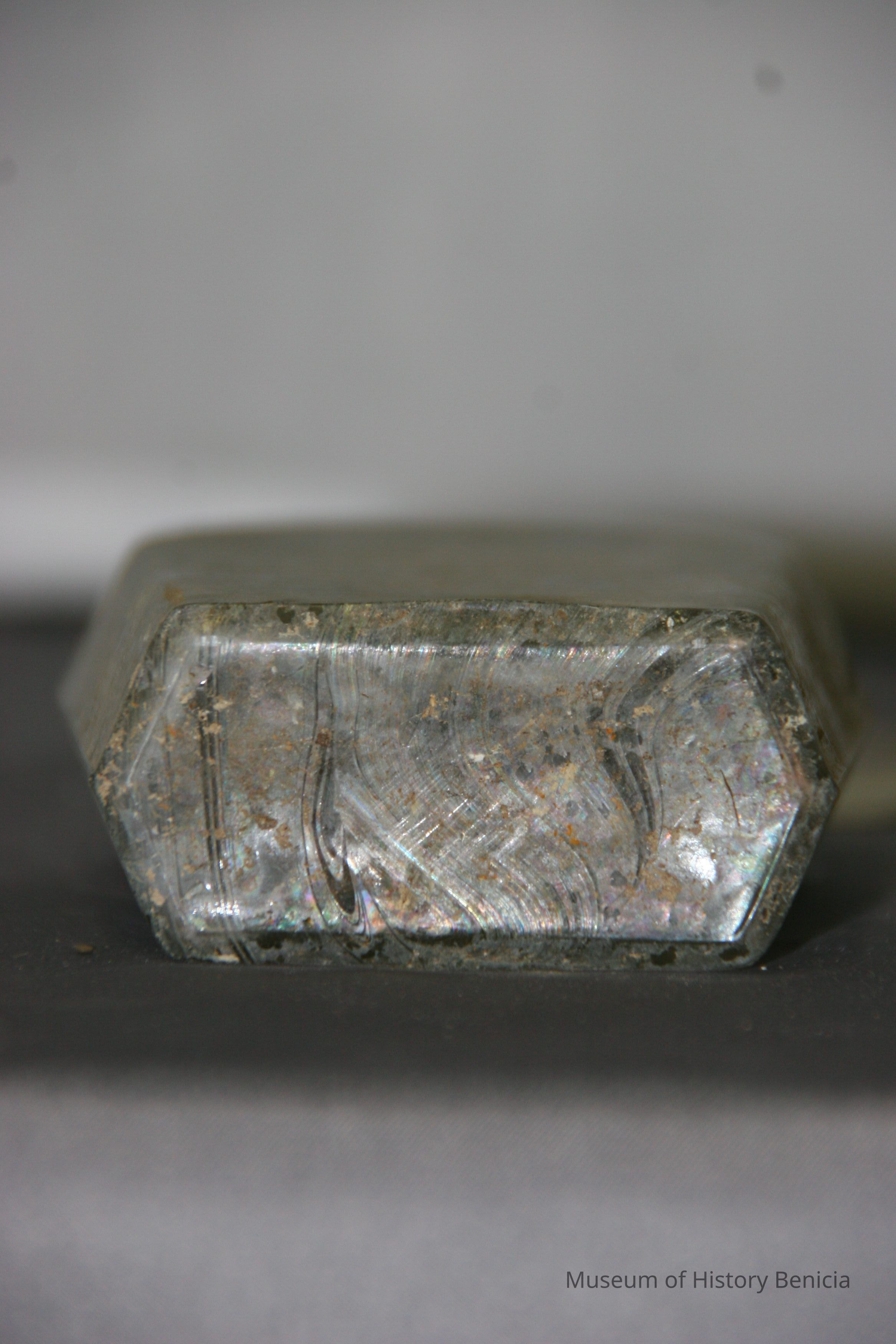 "Coffin-shaped" pocket whiskey flask found at Benicia Barracks site; found near current site of the National Guard Armory on Hillcrest Avenue in Benicia.