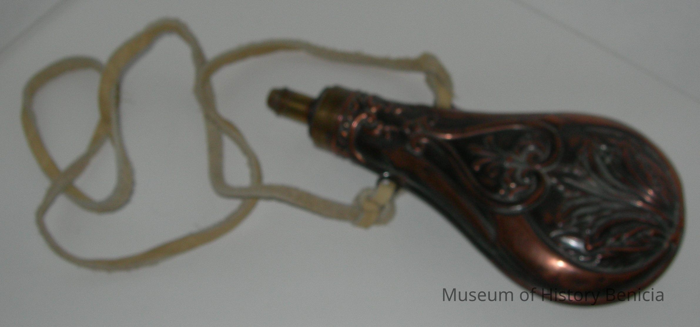 Gun powder flask; molded copper and brass with a rawhide carrying strap; the 40" strap is attached to rings on each side of the flask; it is in good conditon.