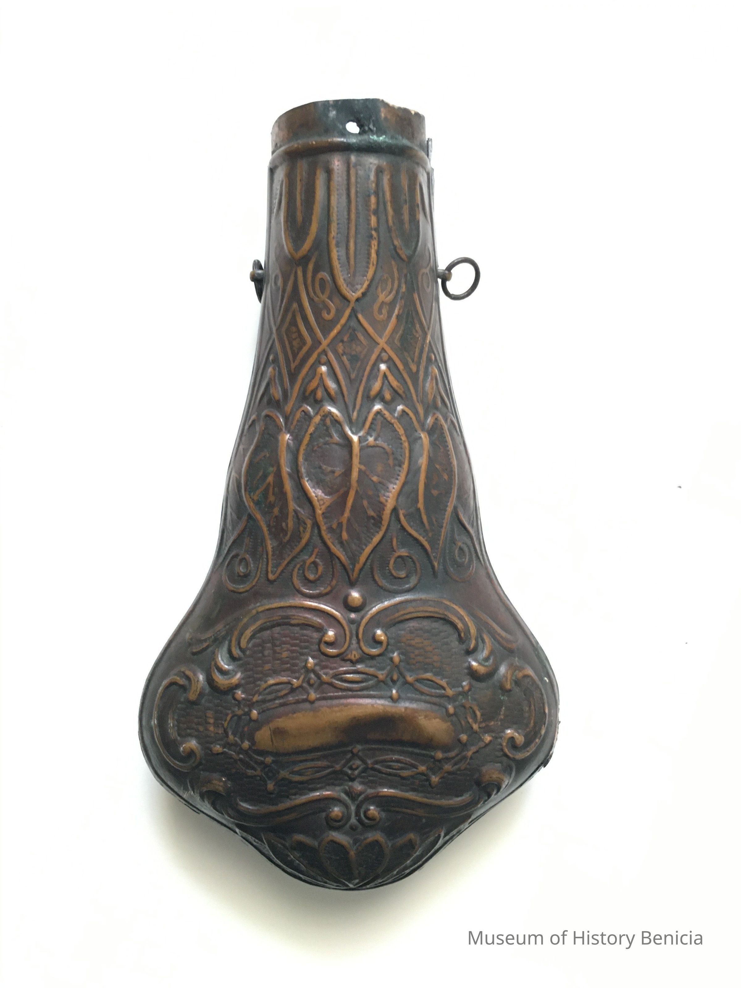Dark copper gunpowder flask with ornate design. Used for storing black gunpowder.