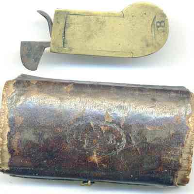 The fleam is perhaps easiest-to-find bloodletting antique. These devices have one or more blades at right angles to the handle. The most common form is a brass case containing 2 or 3 steel blades, often stamped with a makers name (figure 8). The blades were usually of various sizes to offer a selection to the phlebotomist. Many of these fleams were likely used on animals but the ones with small blades no doubt were used at times on humans as well.