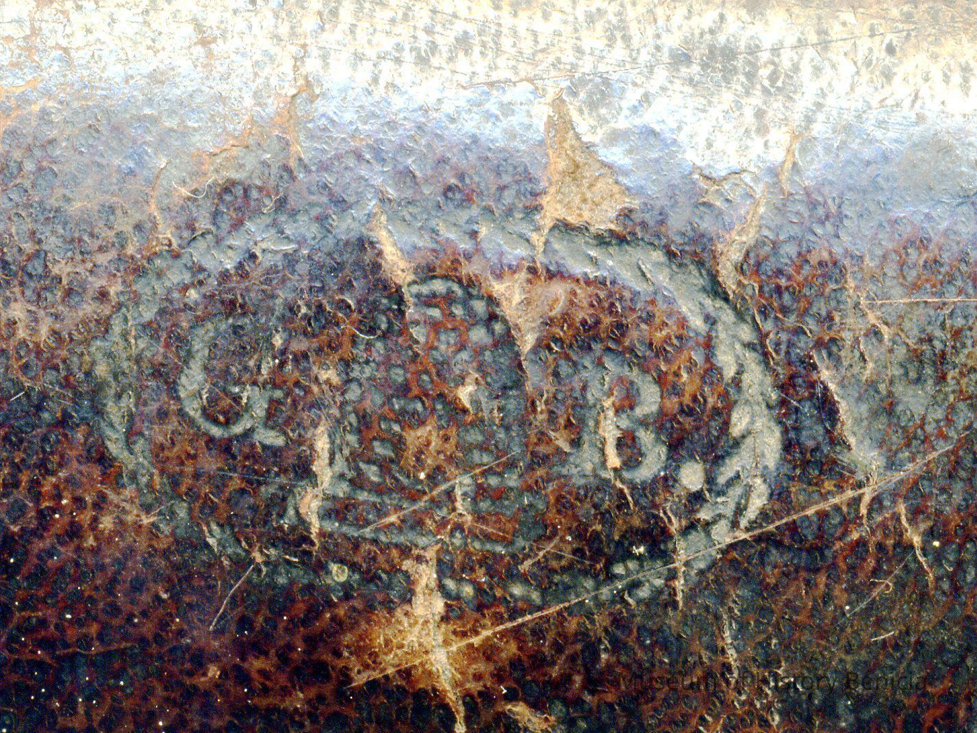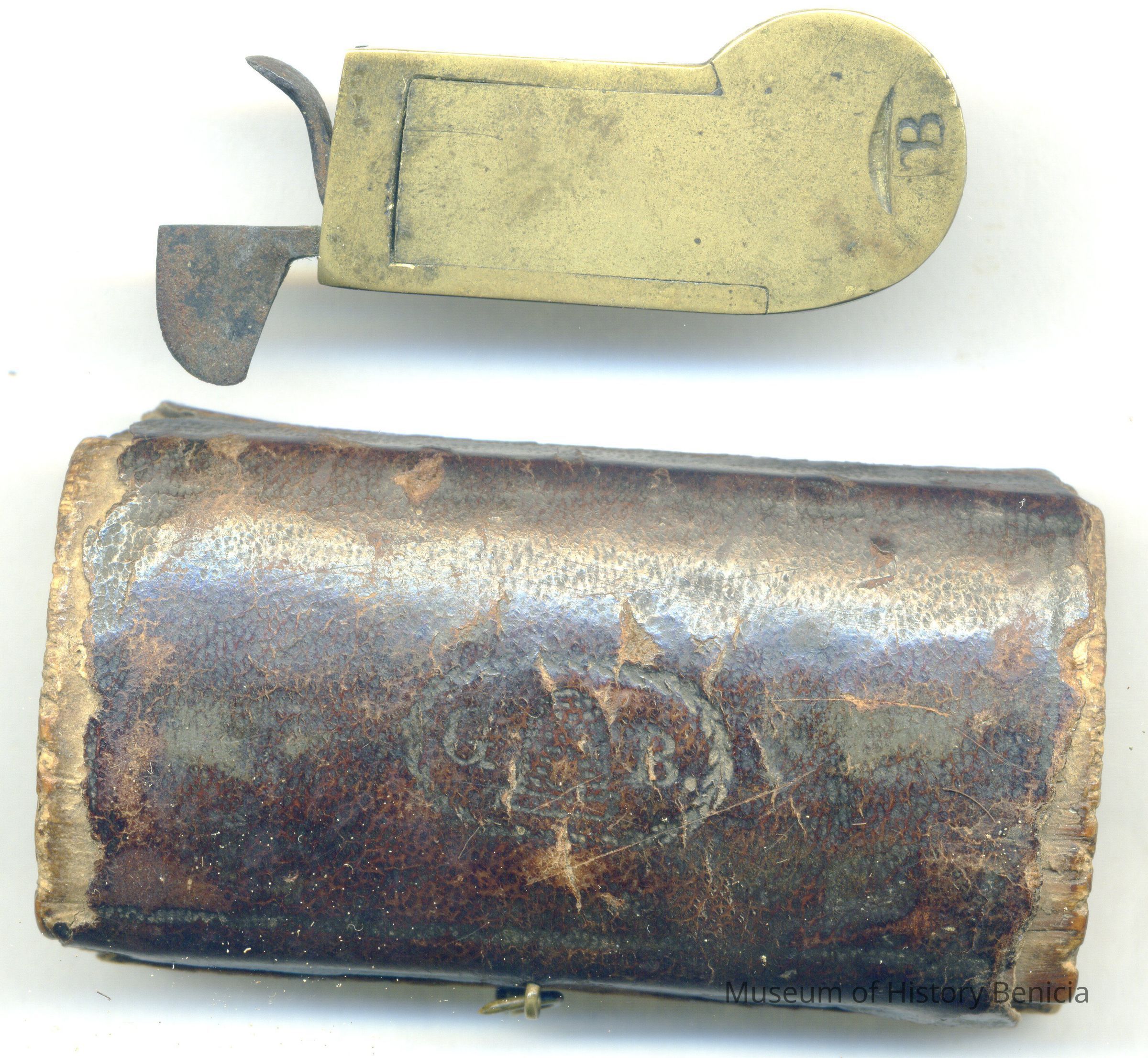 Blood Letting kit. This is a small leather covered kit that doctors used to bleed patients. It is 2.75 x 1.5 x 1 inch. It contains a brass device with a cutting edge and a lever on the other end. On the bottom are the letters "GB" and the inscription G&B embossed into the top of the case.