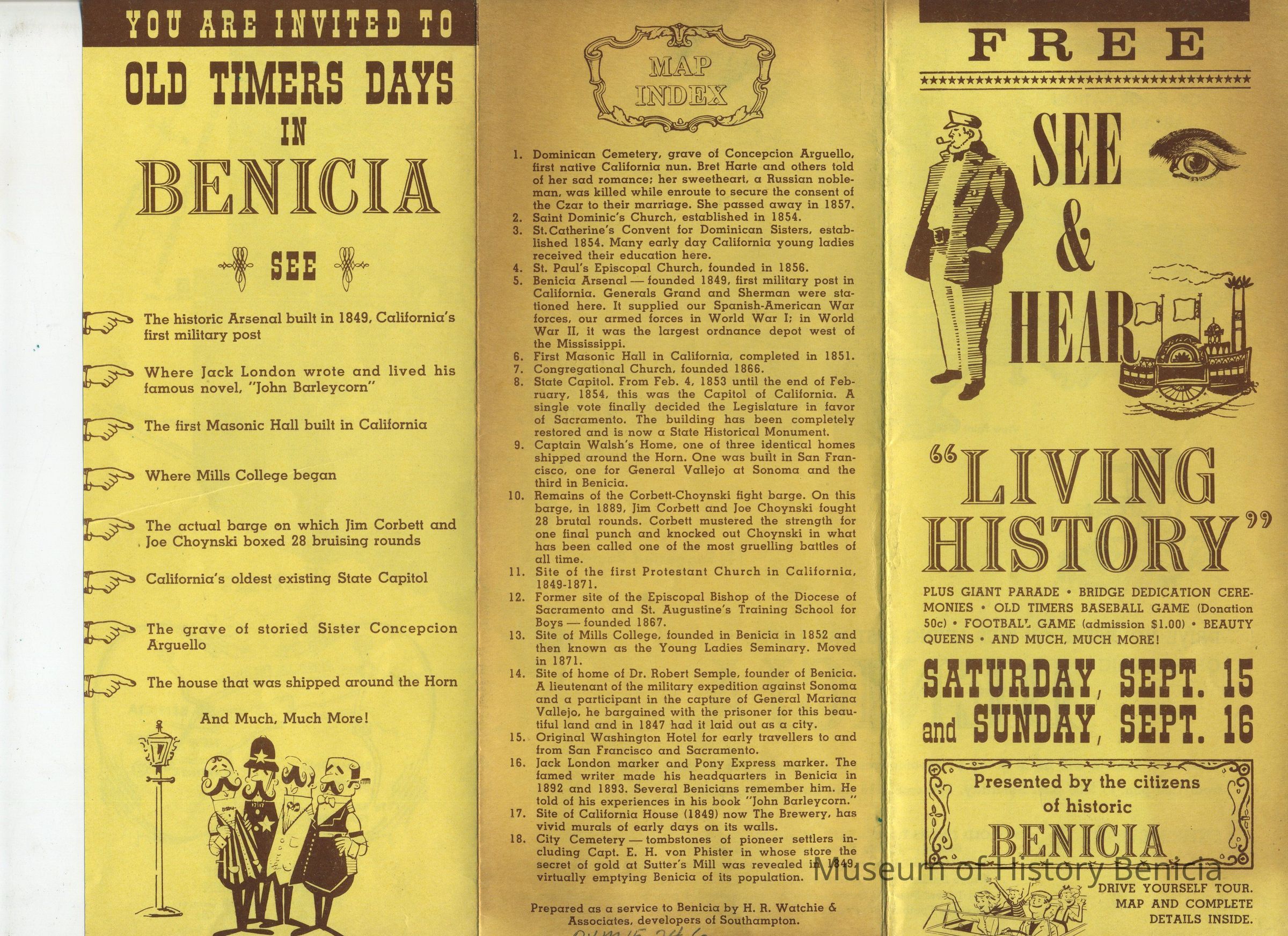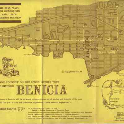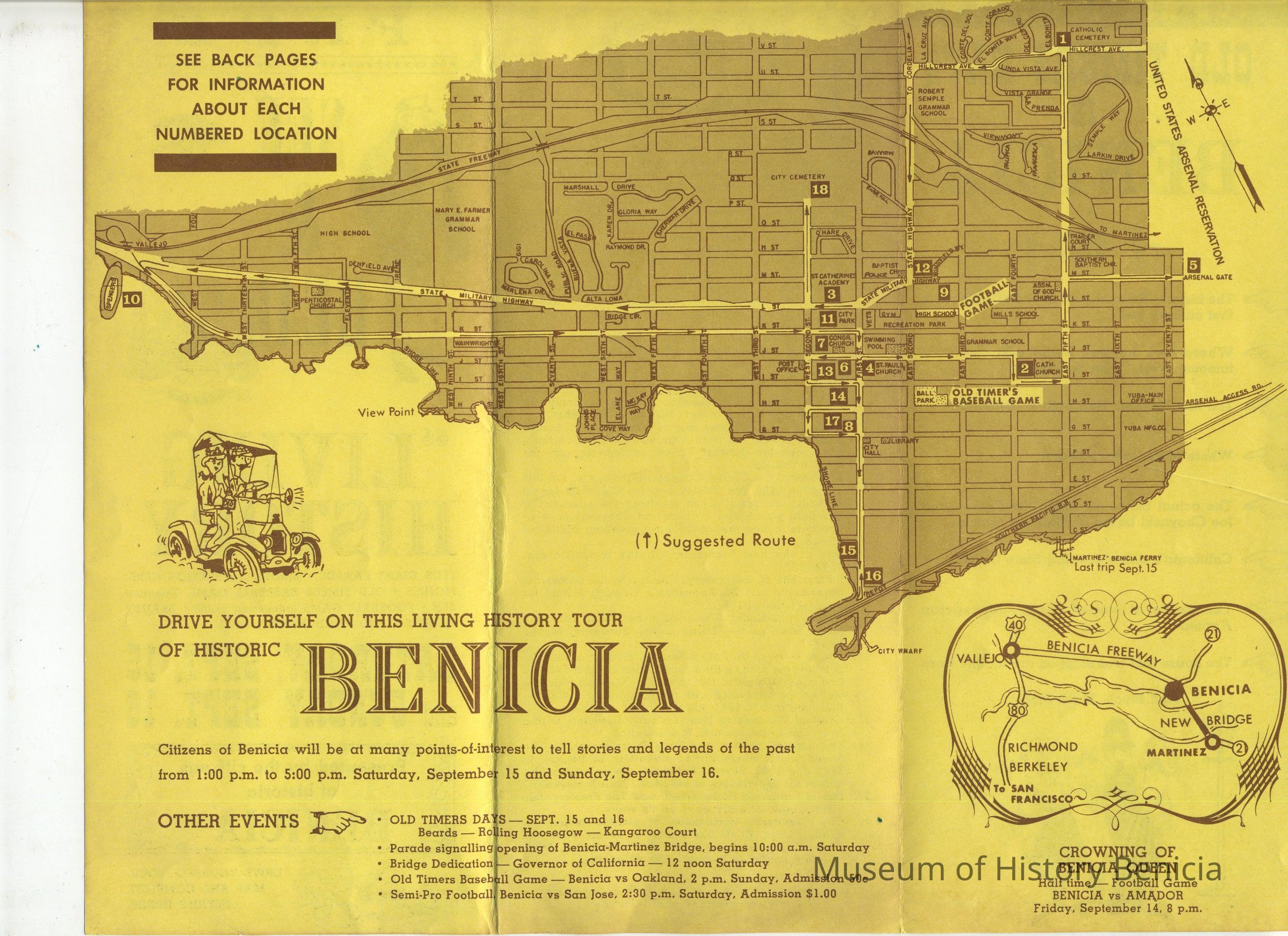 Some of the events: Old Timers' Days; Parade; Bridge Dedication; Old Timers' Baseball game; Semi-pro Football game; Queen crowning at BHS football game; and a self-driving tour of 18 points of Historical Interest in Benicia.