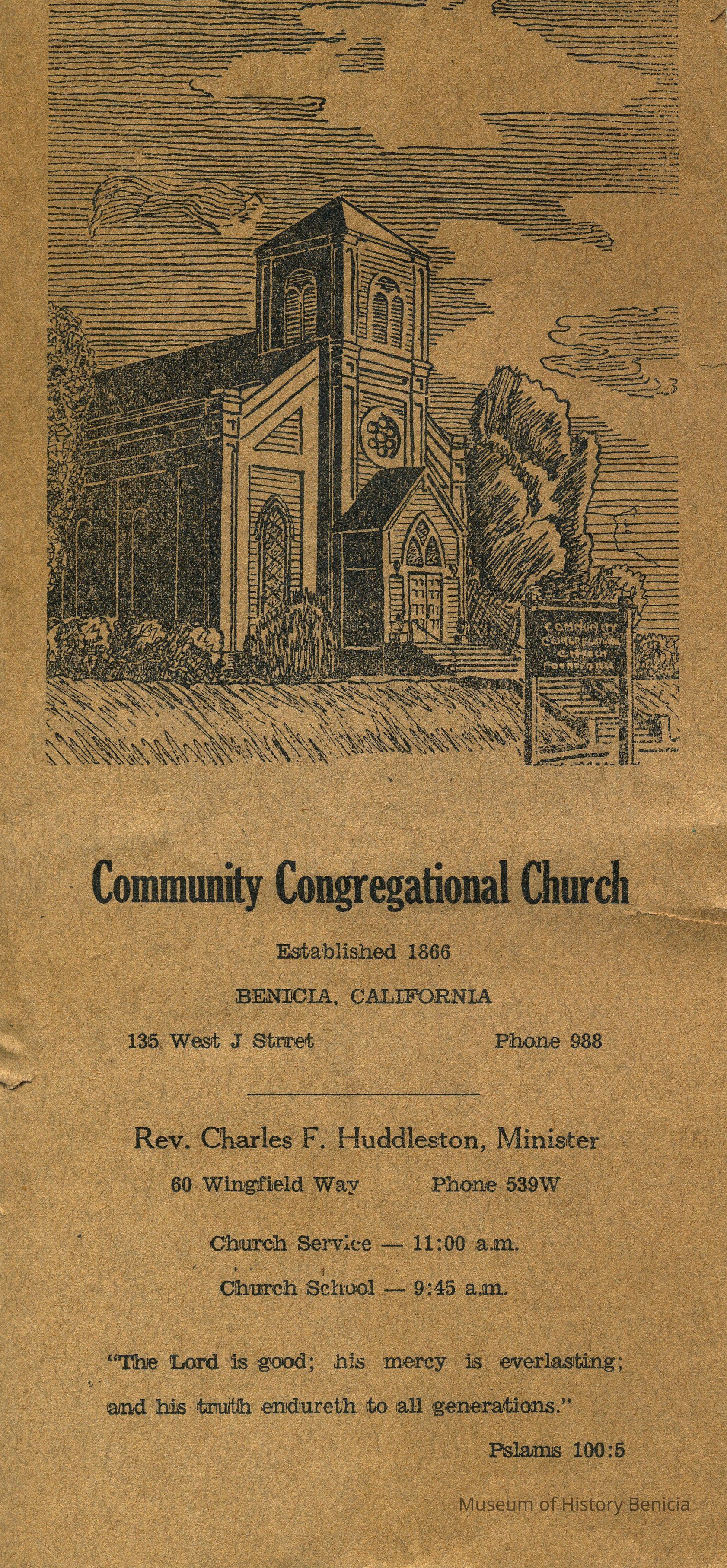 Flier - Community Congregational Church / Established 1866 / Benicia, California / 135 West J Street Phone 988 /