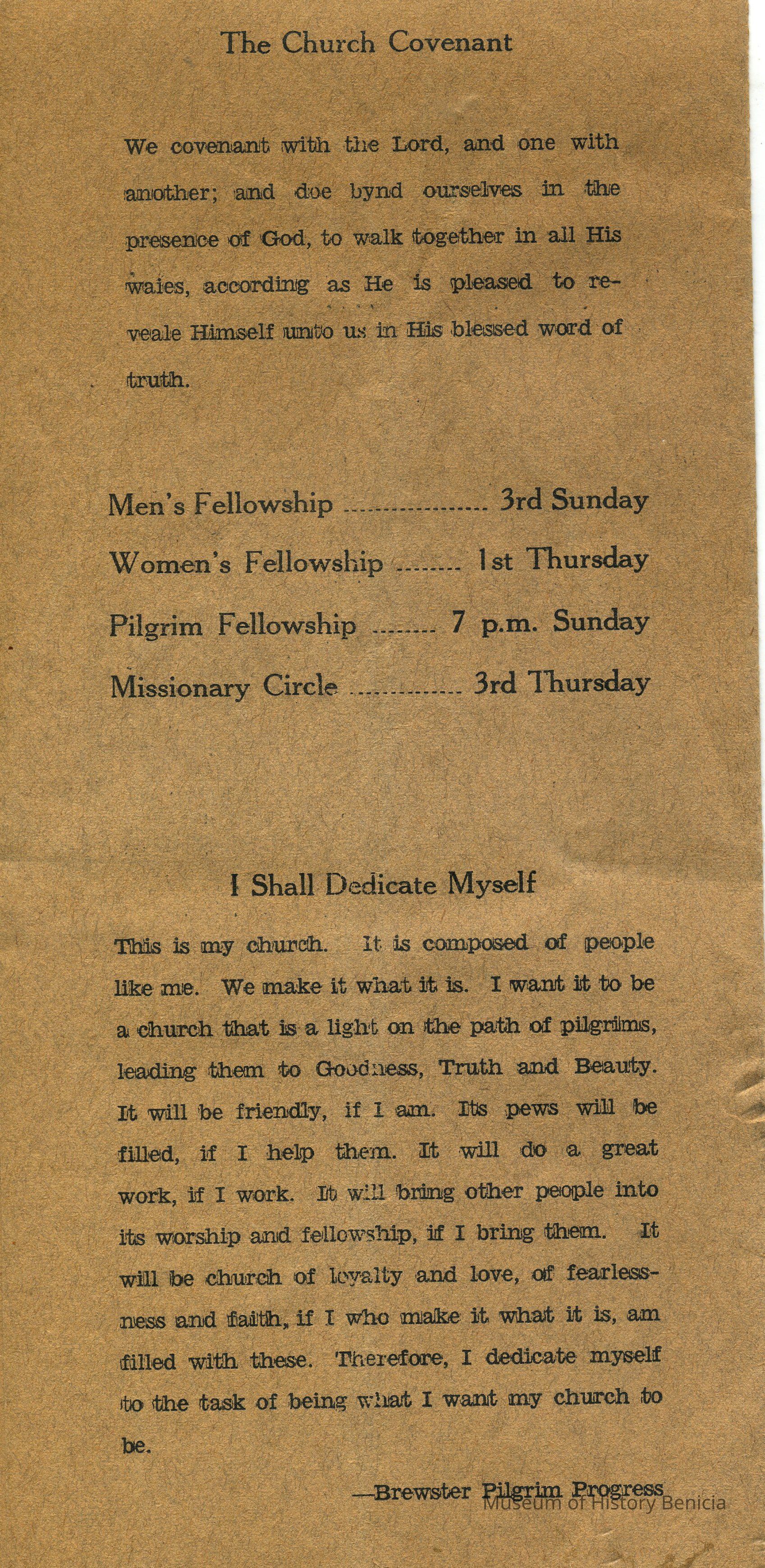 Inside information about Church Services for August 1955 including religious quotes. On the back is The Church Covenant, dates of fellowship meetings and a long quote from "Brewster Pilgrim Progress" about dedication to one's Church.