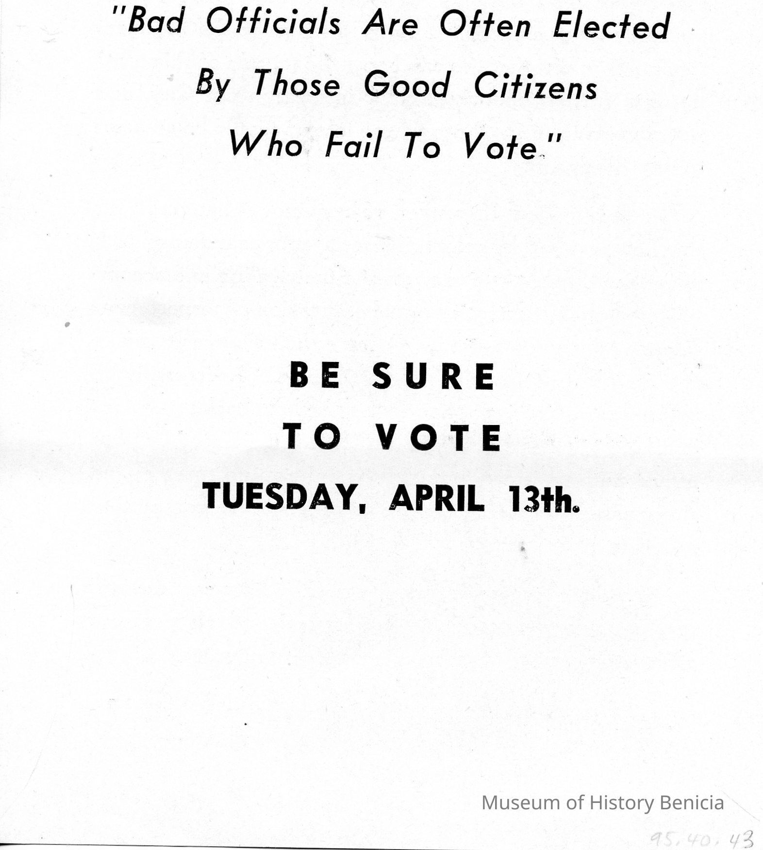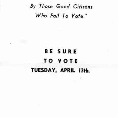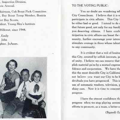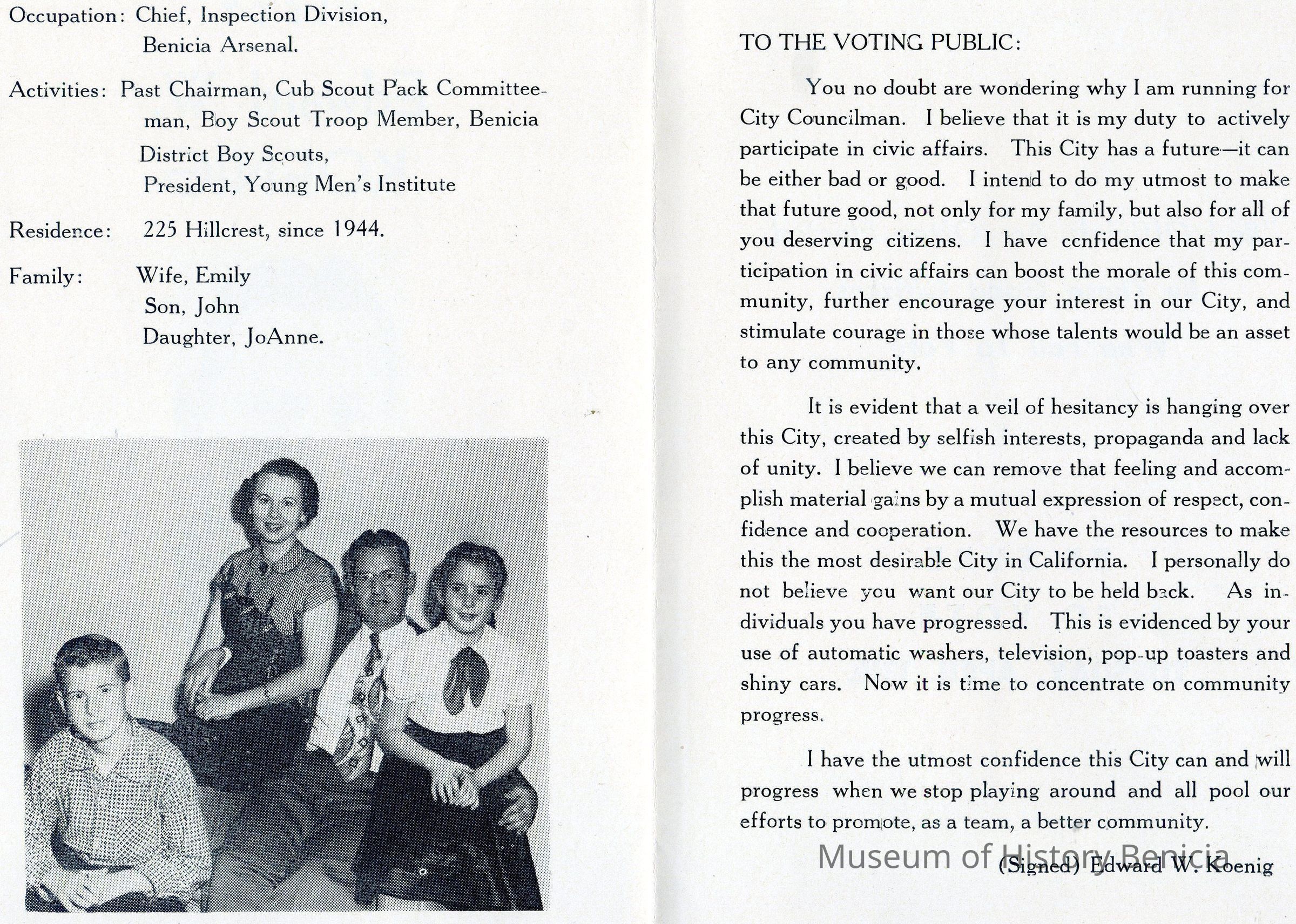 Folded-over political flier to advertise the candidacy of Edward W. Koenig for City Councilman; includes a photograph of the family, personal information and a message to the voting public. On the back: "Bad Officials are often elected by those good Citizens who fail to vote" and "Be sure to vote Tuesday, April 13th" [1954]Collection