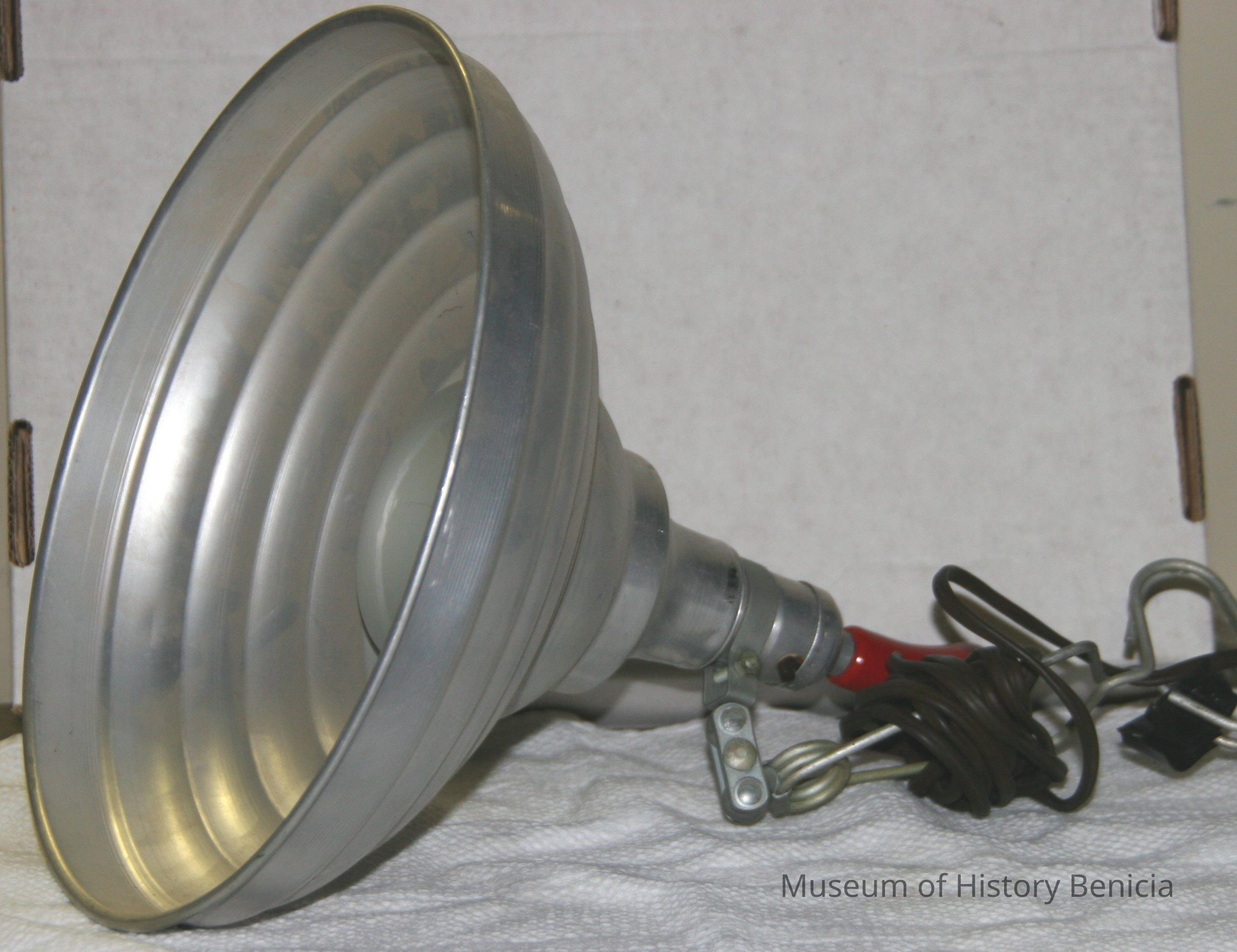 silver metal hood w/red wood handle. electric wire & clamp