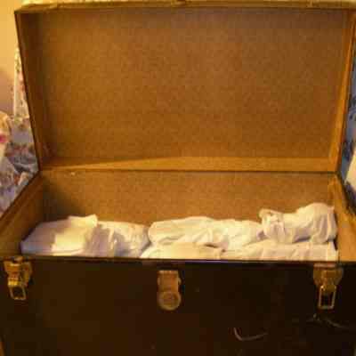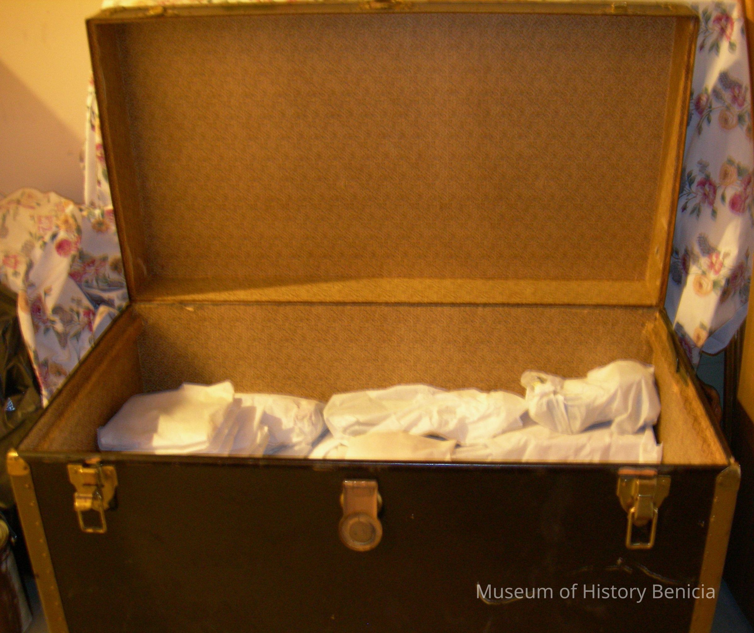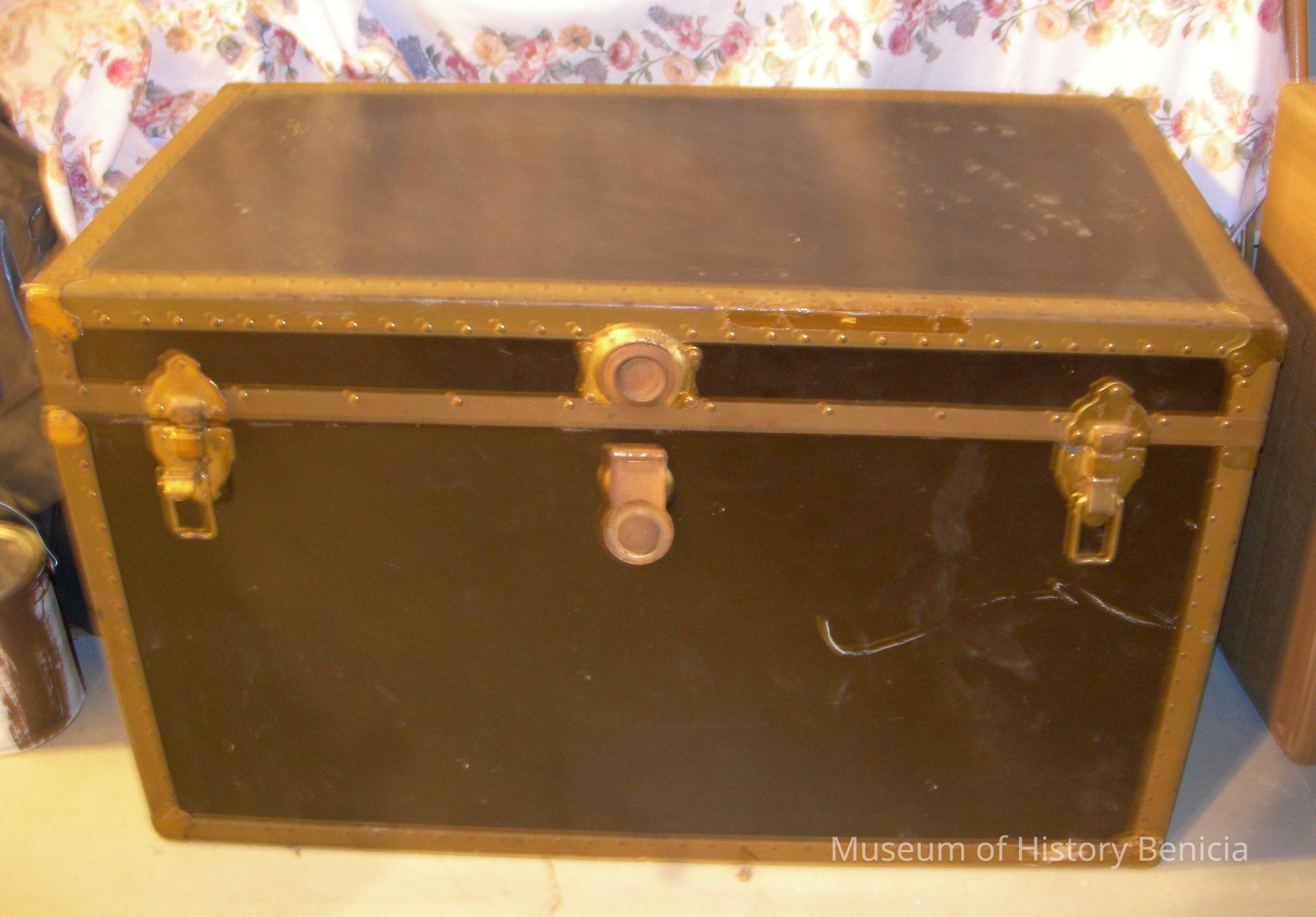 WWII footlocker belonged to Kenneth Nunn. Black painted (or vinyl laminate) wood; brass riveted trim on all edges; leather strap handle on each side; snap locks on each end of front; lock w/hasp in center front; brown and tan patterned paper lining inside; 1" ledge on each side inside indicates there was once a tray (not with donation)Collection