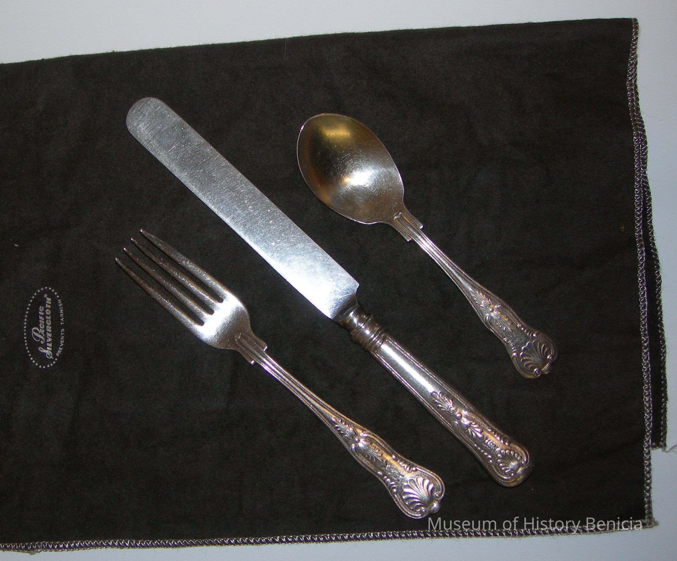 Silver dinner fork, ornate, marked USN; long tines, 7-1/4" long x 1" wide wrapped in treated cloth
