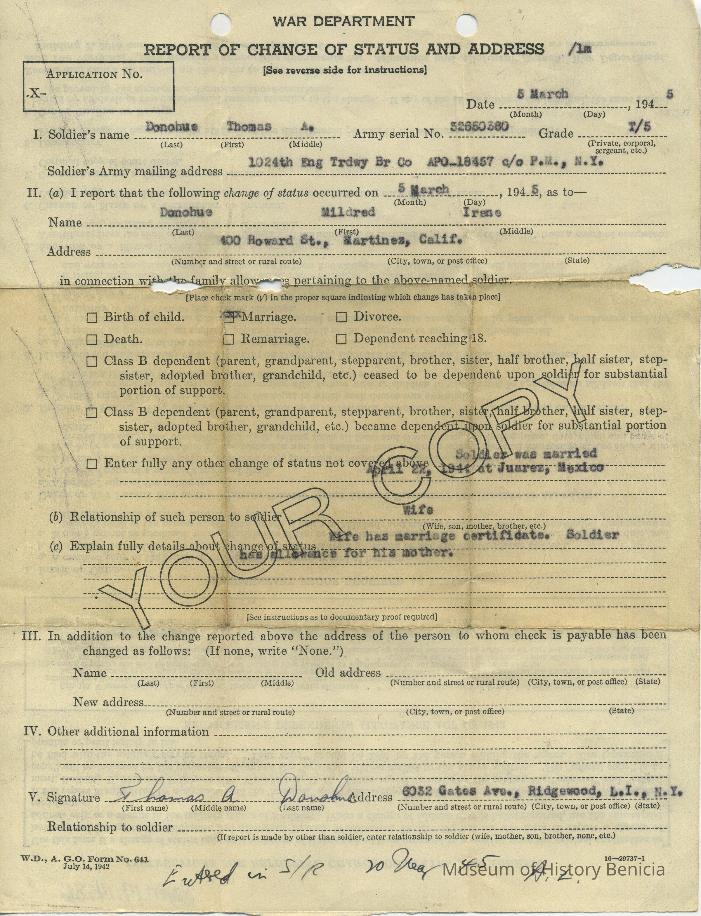 Thomas Donohue - change of status for family allowance due to marriage (April 22, 1944 @ Juarez Mexico) to Mildred and address is now 400 Howard St., Martinez, CA 8" x 10-1/2"