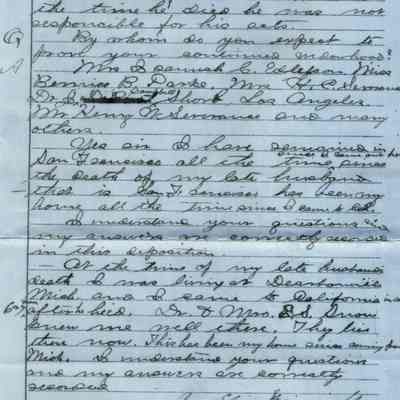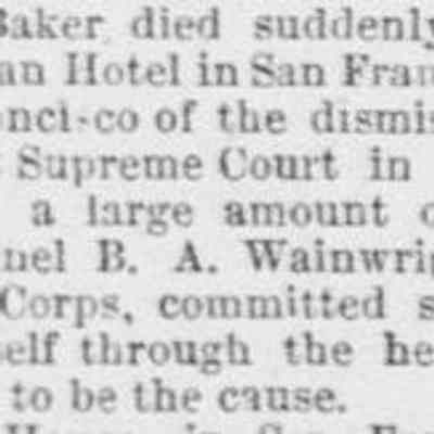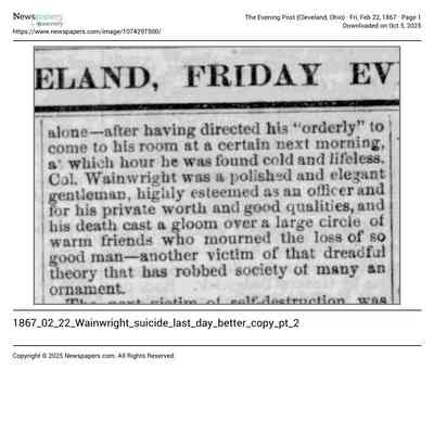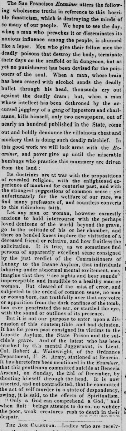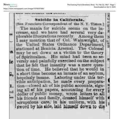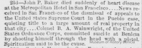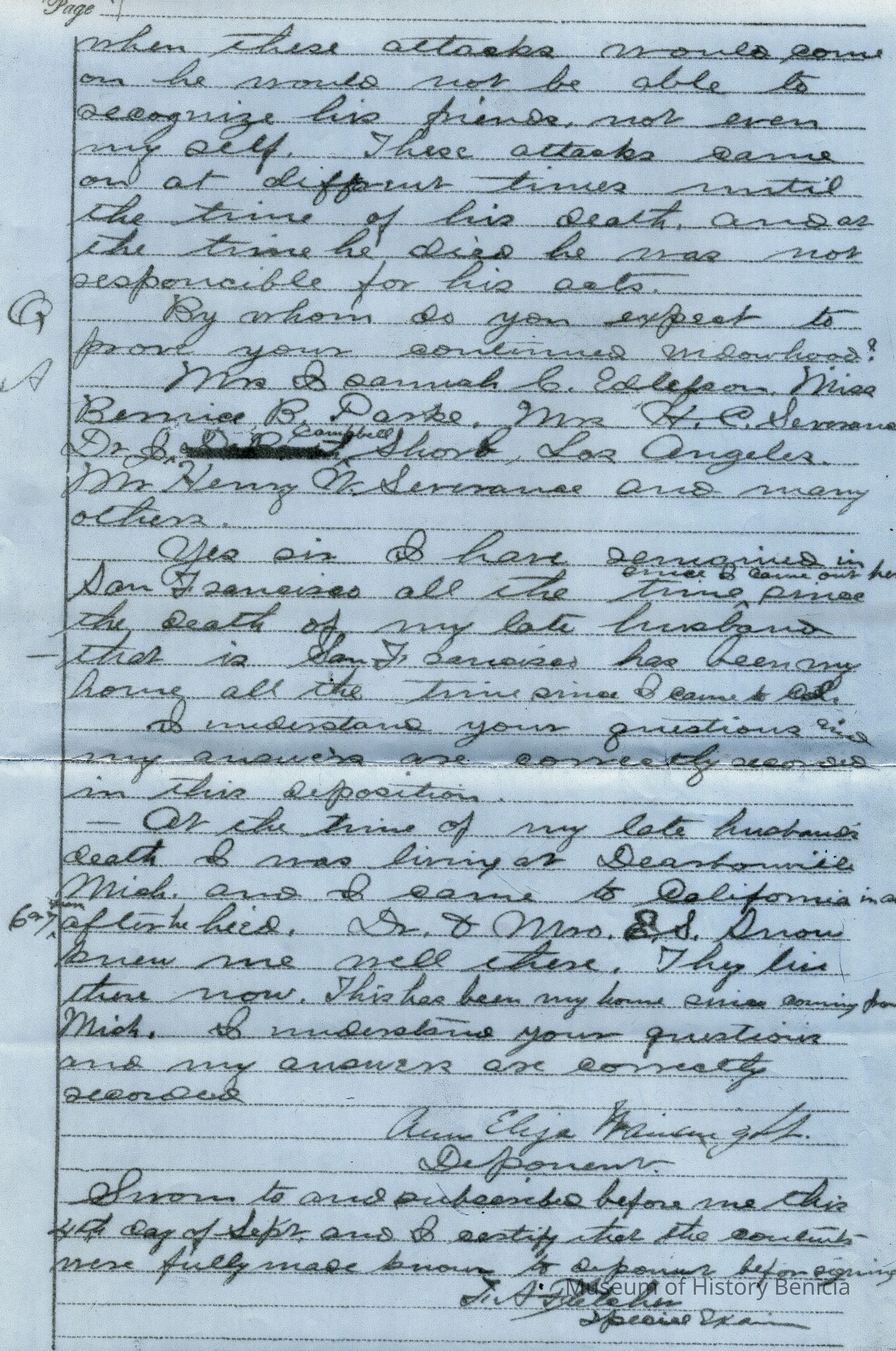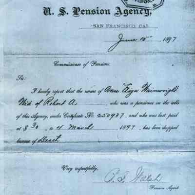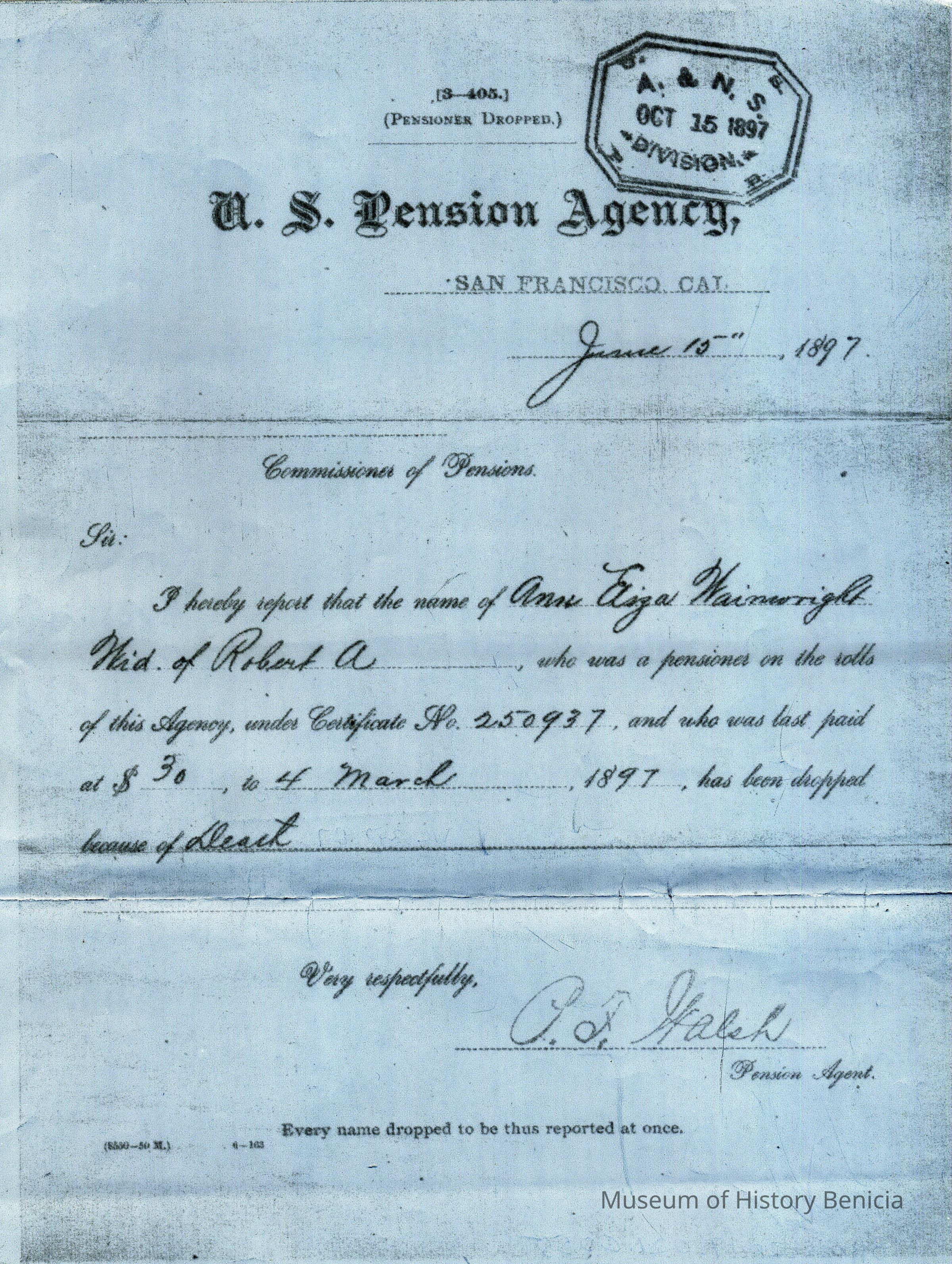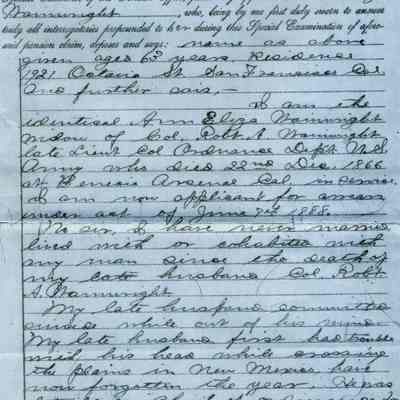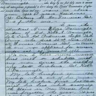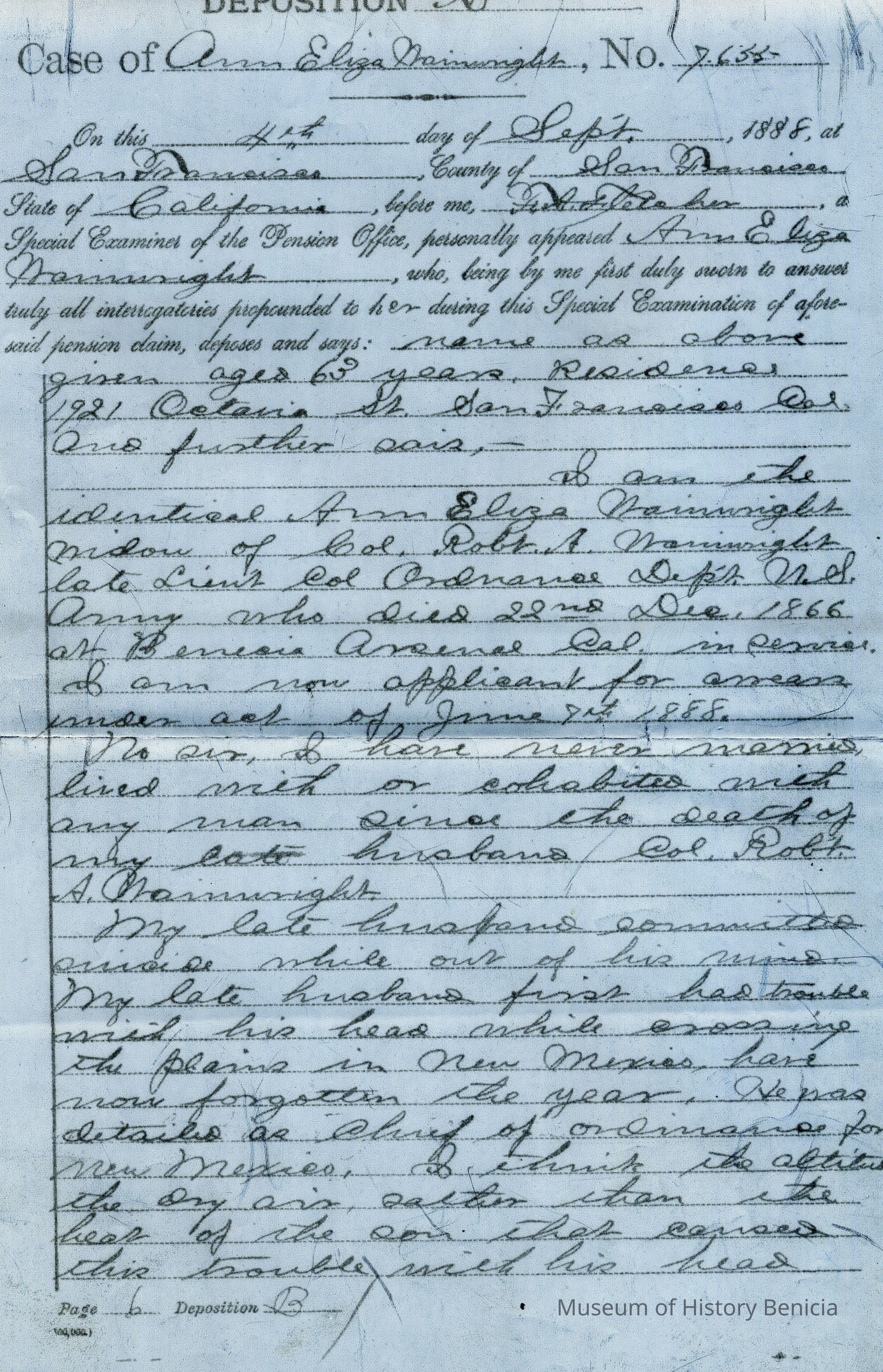 This is a copy of the deposition from Mrs. Anna Eliza Wainwright, wife of Col. Robert A. Wainwright, in regard to her application for government pension. Her husband was the Commanding Officer at Benicia Arsenal from 1864 to his death December 22, 1866. She states that her husband committed suicide. She also says that he was out of his mind at the time.