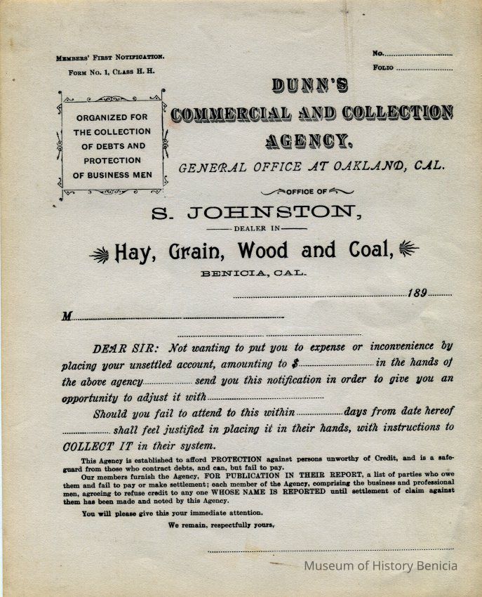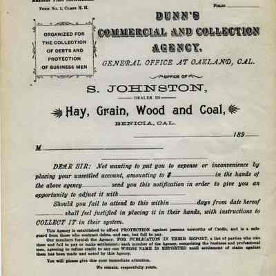 Blank forms used by S Johnson Hay, Grain, Wood and Coal dealer in Benicia in the 1890's to warn customers who were in arrears that their account might be turned over to a collection agency. The collection agency was named "Dunn's Commercial and Collection Agency". Interesting that we use the term "dun" to mean insisting on payment from someone who owes a debt.Collection