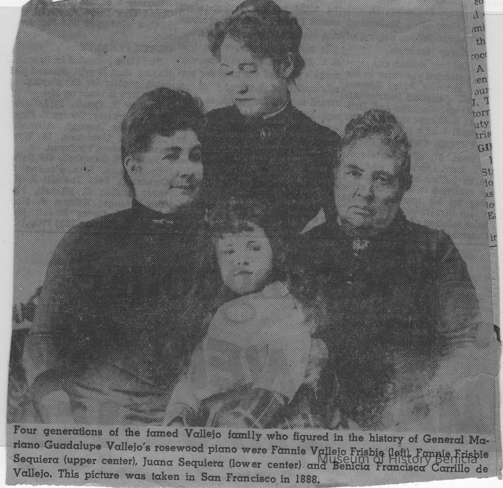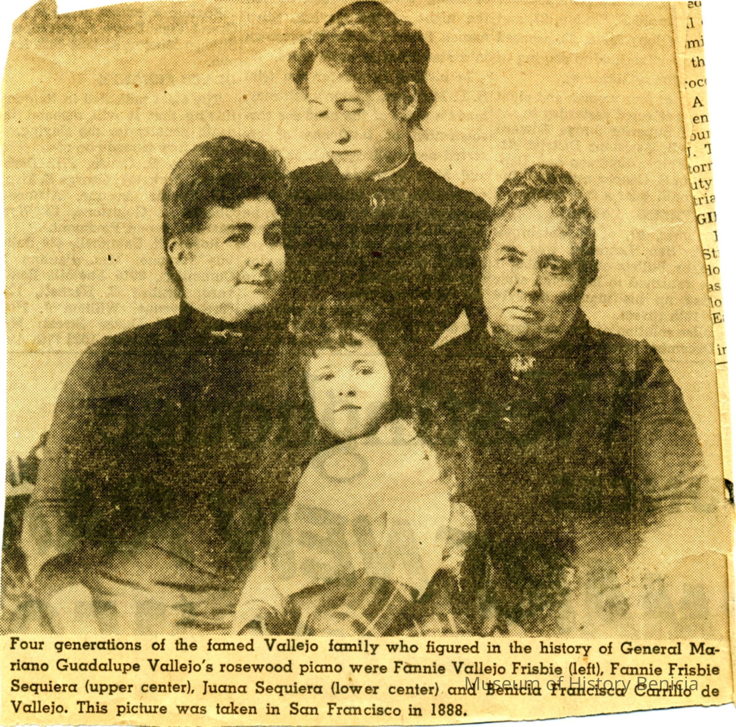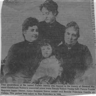 Photo [from newspaper] of "four generations of the famed Vallejo family...Fannie Vallejo Frisbie, Fannie Frisbie Sequiera, Juana Sequiera, and Benicia Francisca Carrillo de Vallejo. This picture was taken in San Francisco in 1888."