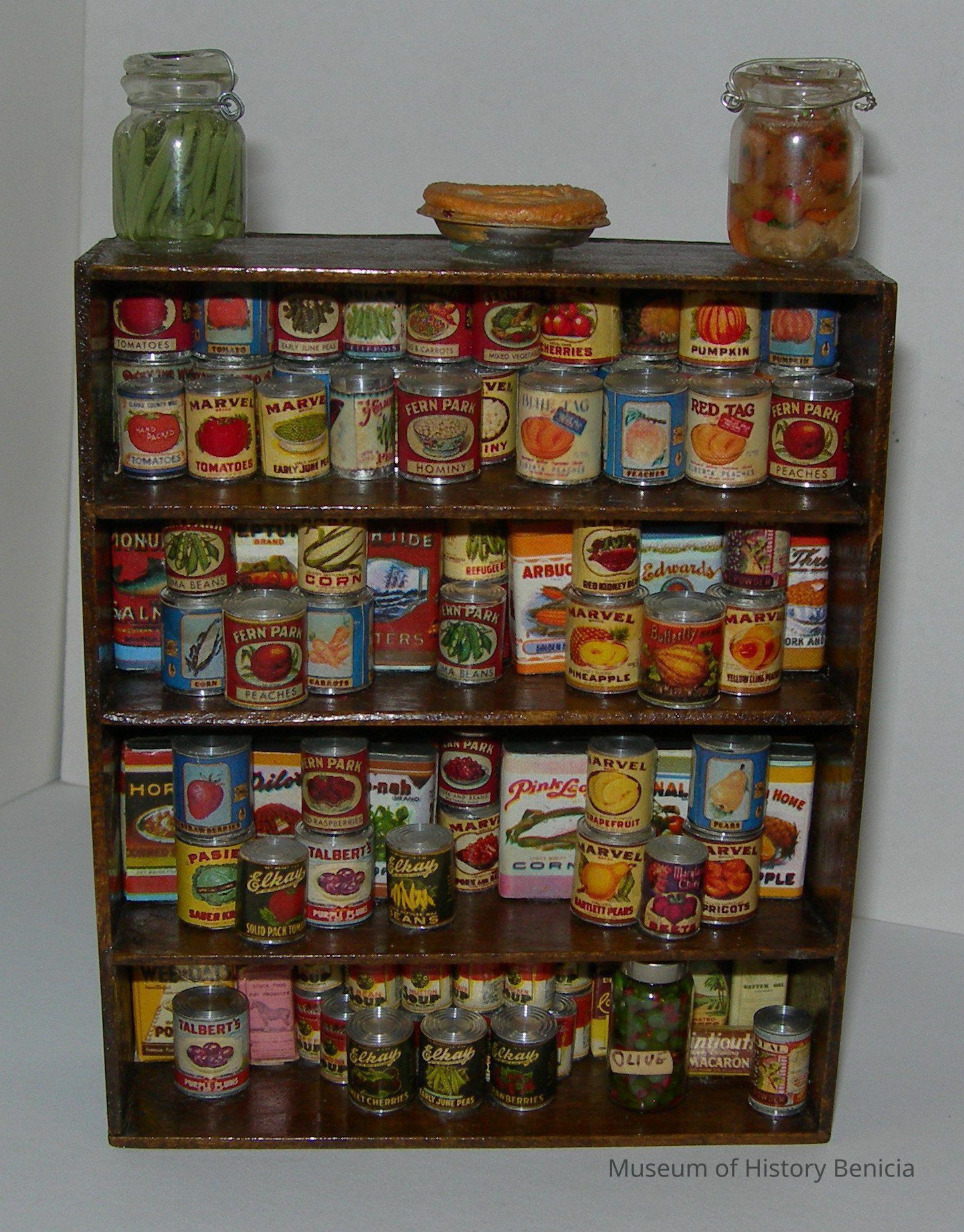 Wooden shelf unit - four shelves filled with canned goods and home canned items in jars;