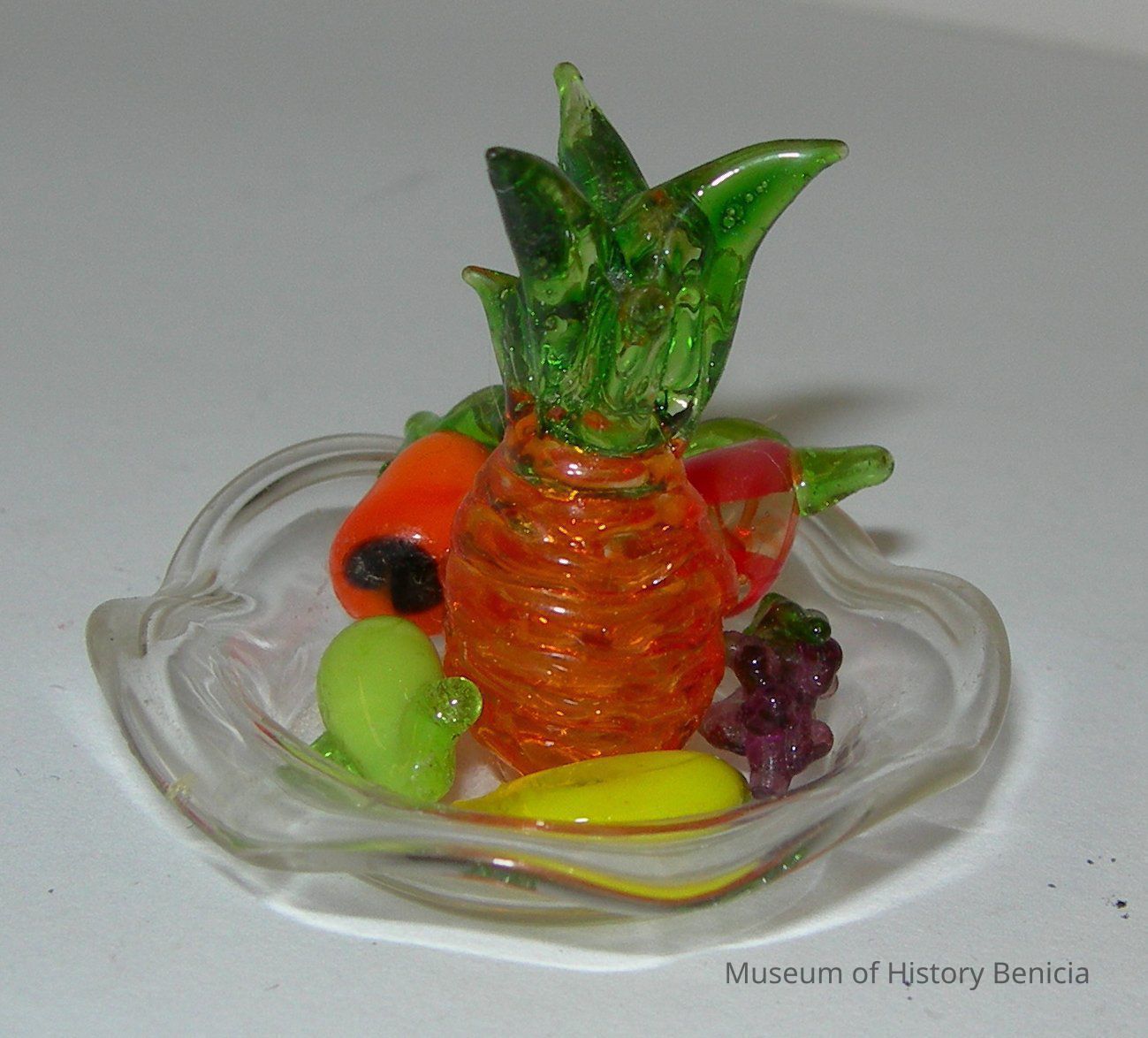 Clear dish with "glass" pineapple and five other fruits -room decoration the extra fruit is not with the dish - they are in 2/C26