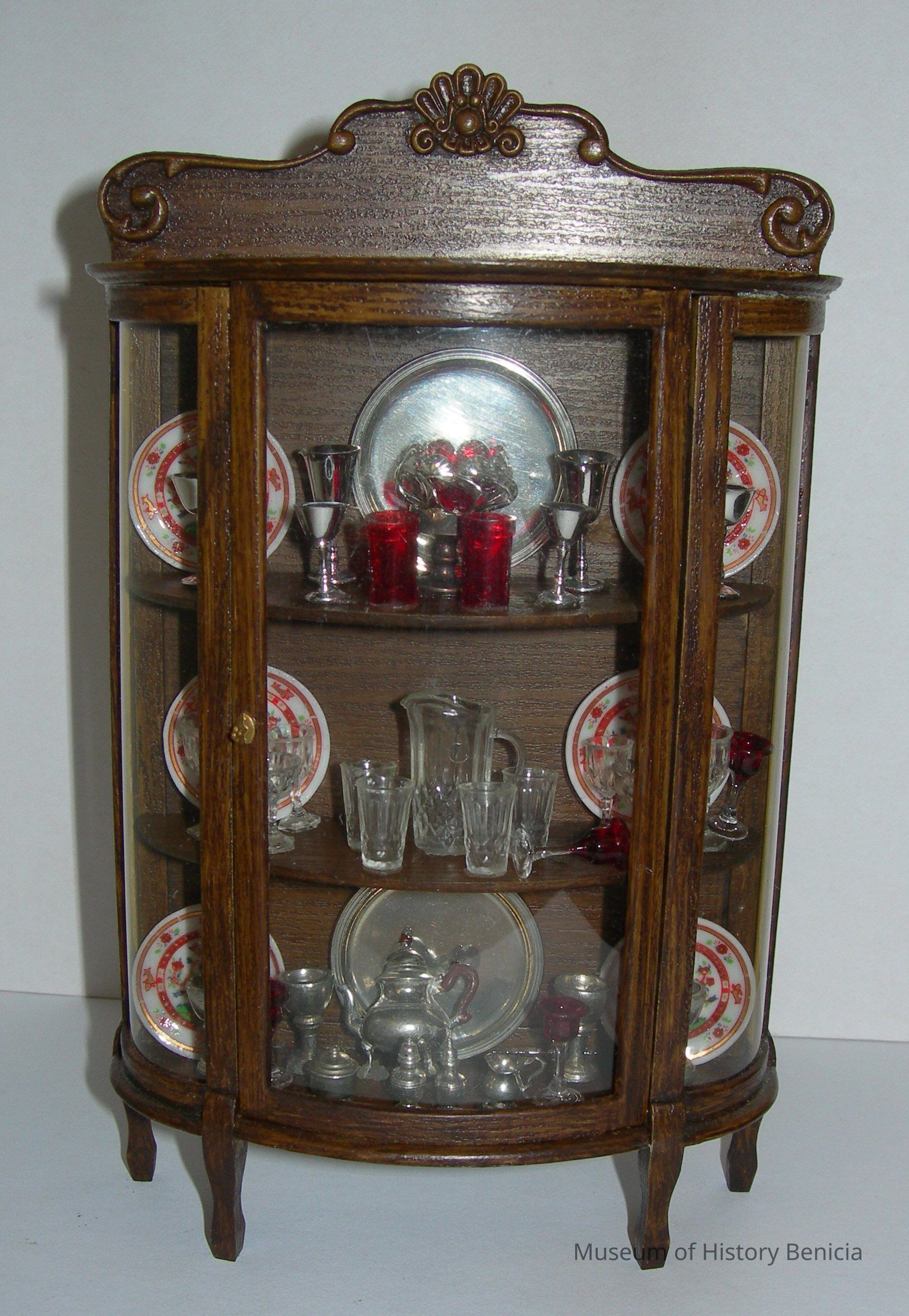Brown, plastic, curio cabinet; has stiff plastic in the openings to imitate glass door and side windows; has three shelves containing decorative plates, pitcher and glass set; "silver" plate, goblets, coffepot, and other table accessories; one side is flat to sit against a wall, front is curvedCollection
