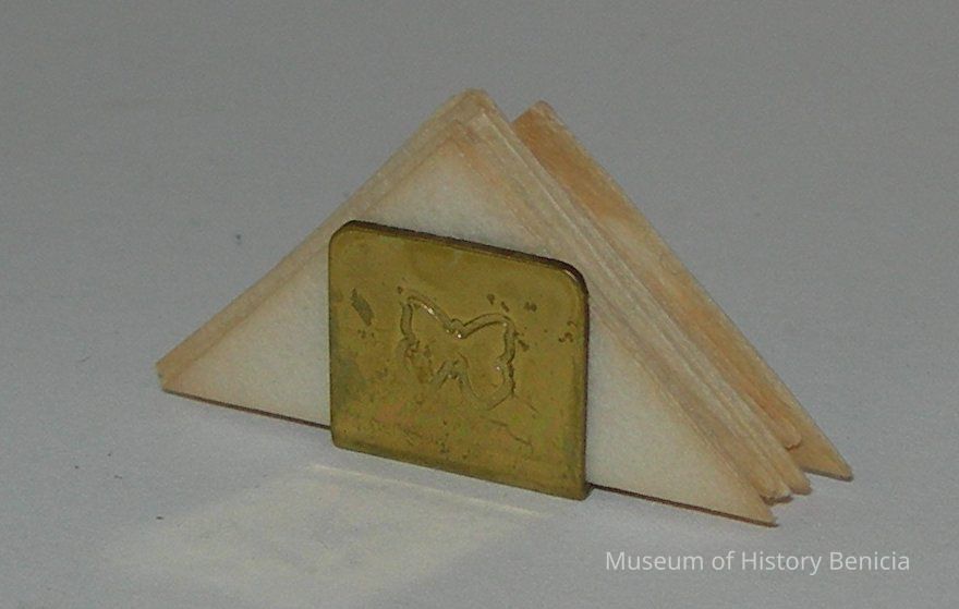 Metal, gold-colored napkin holder with six triangular-folded napkins; butterfly imprint on each side