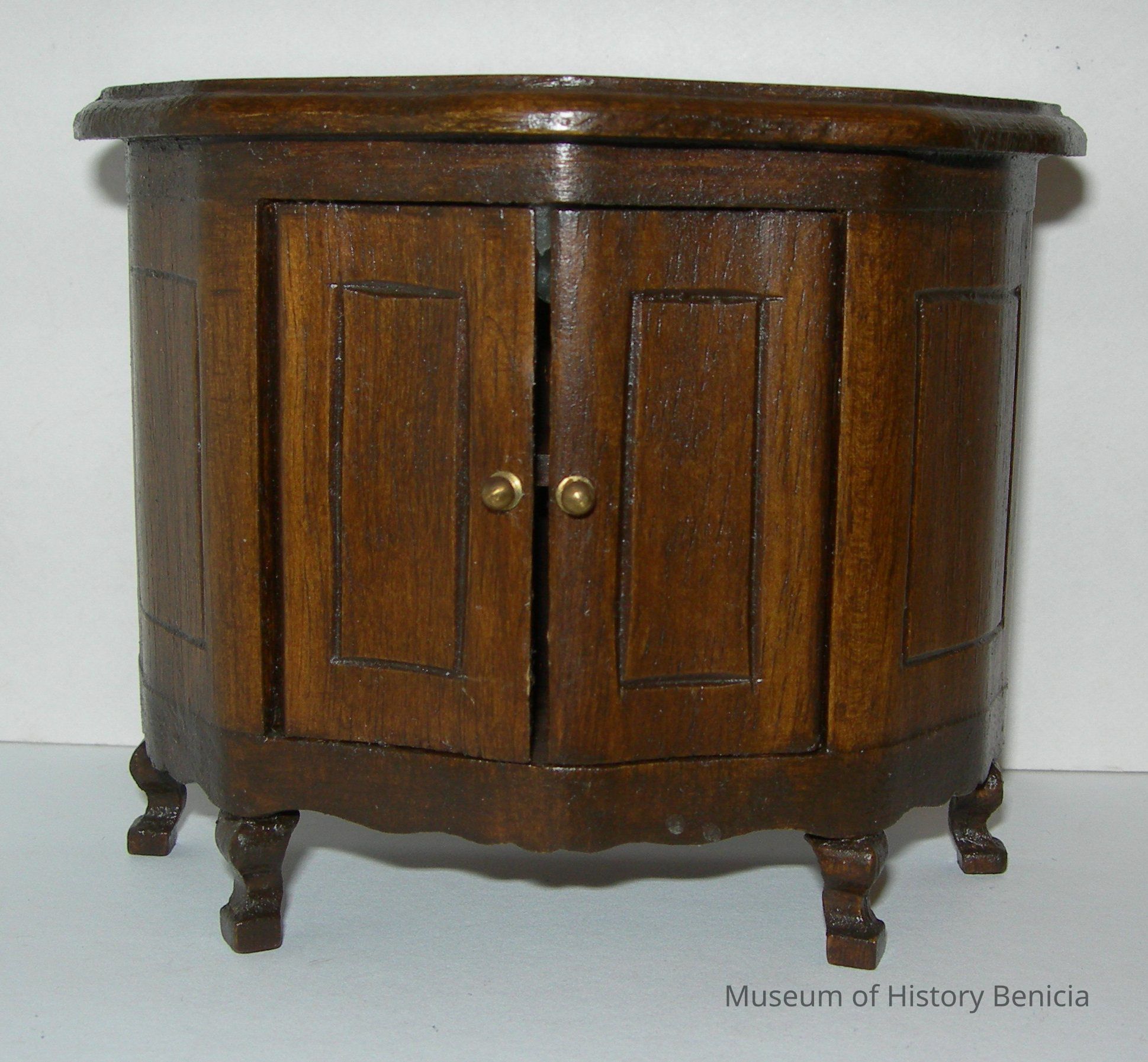 Brown, wood, curved front/flat back cabinet; has two doors in front that open (are held closed with wax)