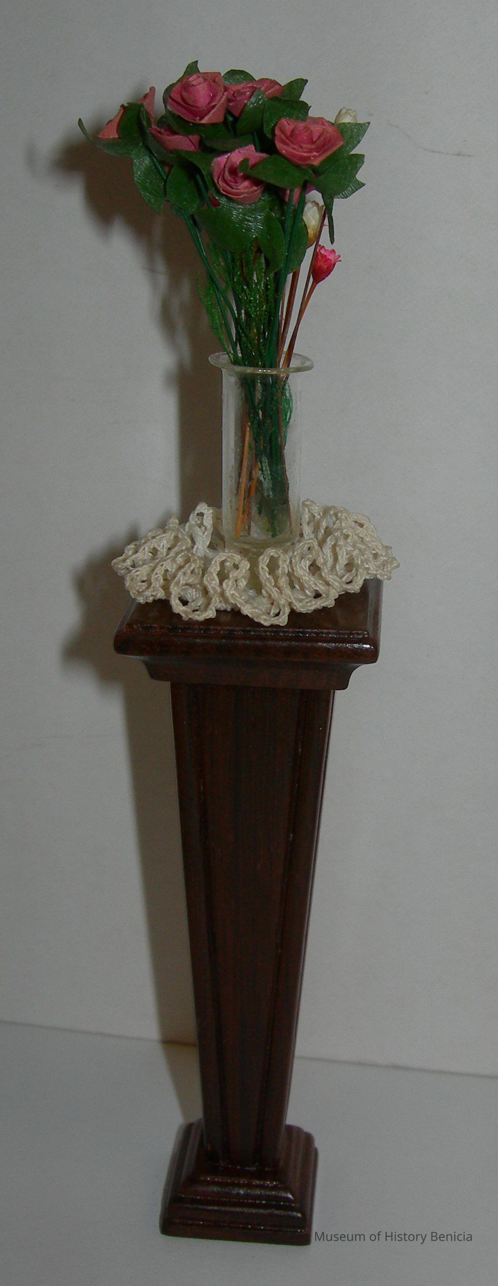 Brown wood pedestal with a crocheted doily and vase of flowers (look like roses) on top; clear vase flowers not stored with pedestal