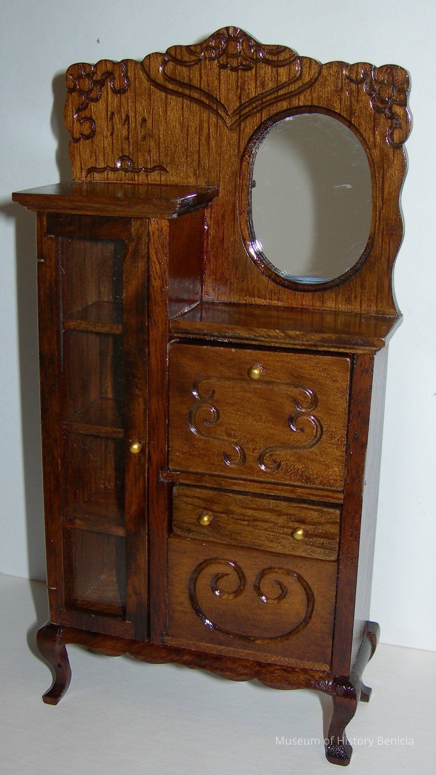Wooden, high, bedroom dresser with mirror; has drawer and two doors that open; on on the left has "glass" which reveals four shelves which are empty; drawer and other area also emptyCollection