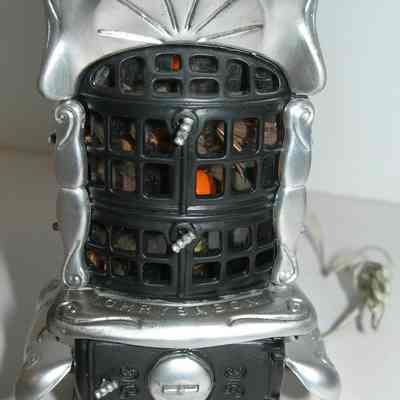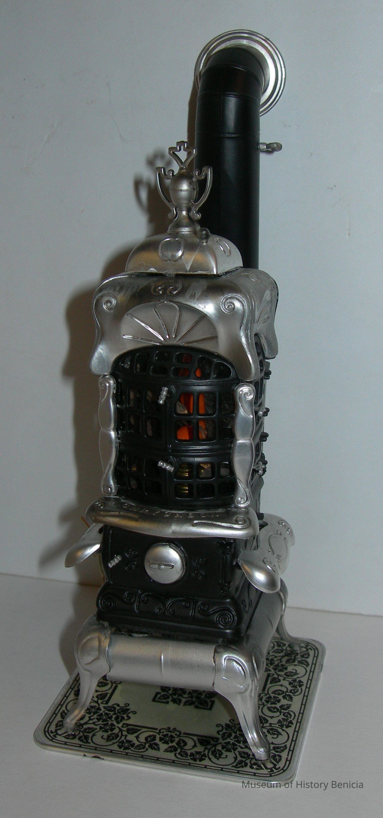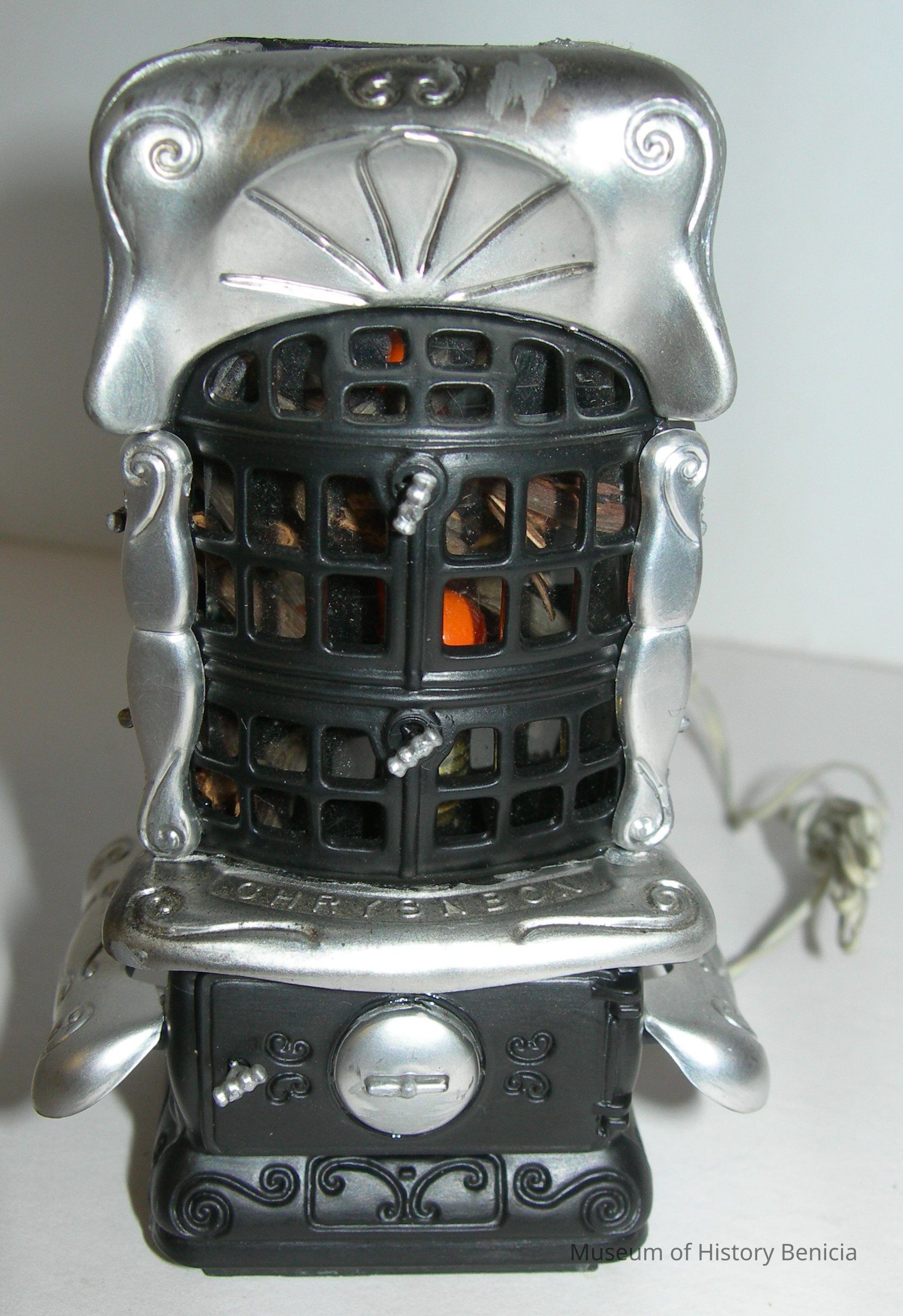 Main section of a wood-burning heater/stove; it is black and silver; it is electrfied and there are orange bulbs inside to simulate fire; there are 21 small pieces of wood inside (logs)