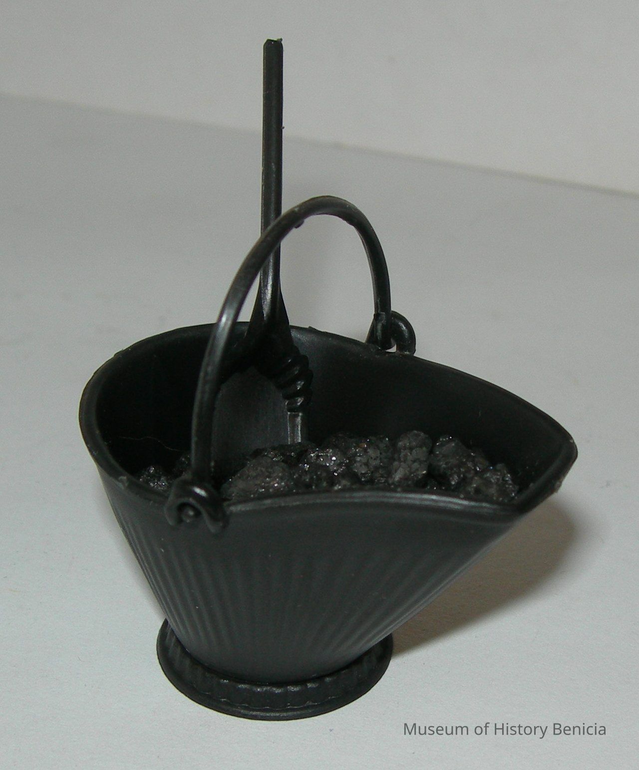 Black, handled coal scuttle with small pieces of "coal" inside BHM2013.008.0231a - coal shovel